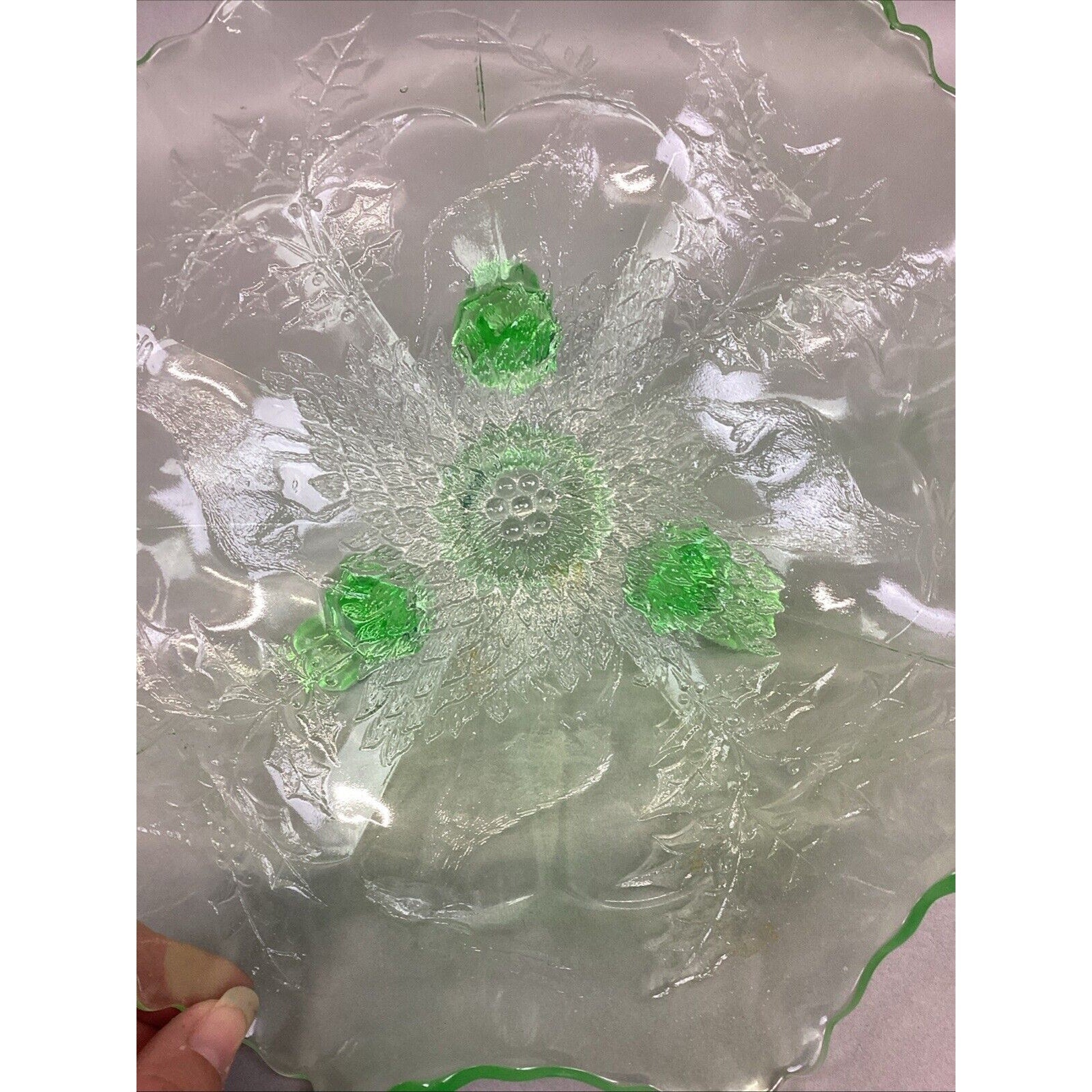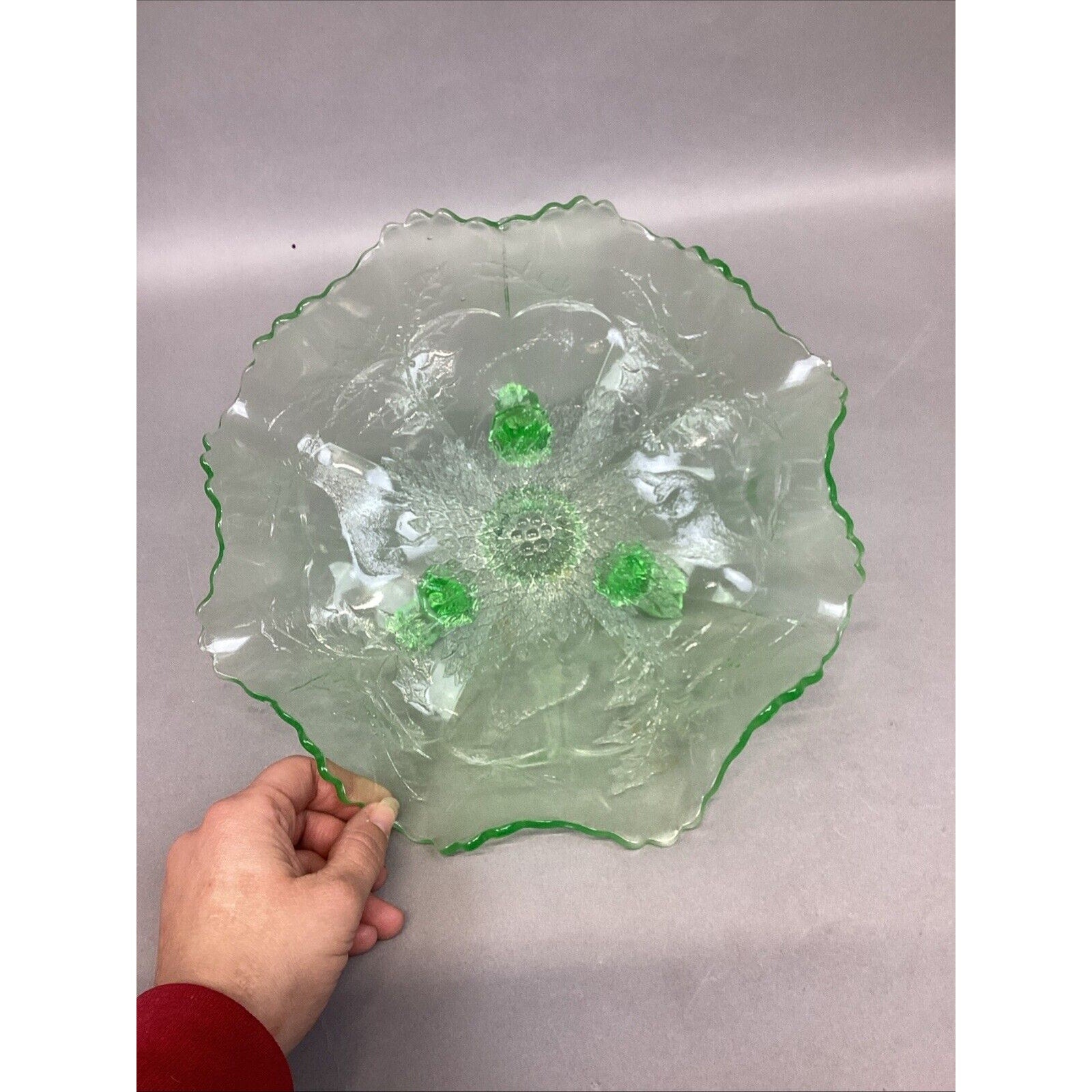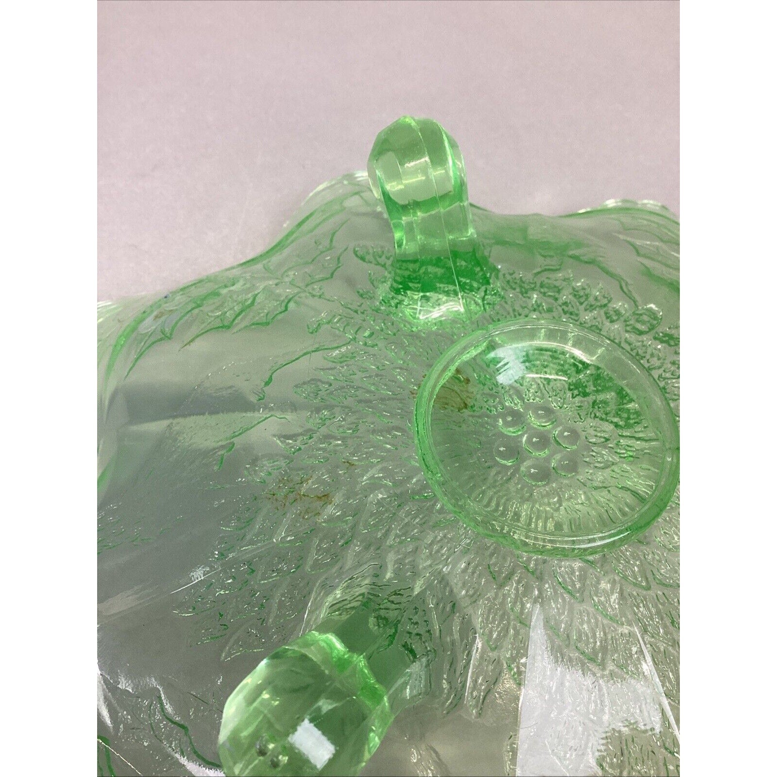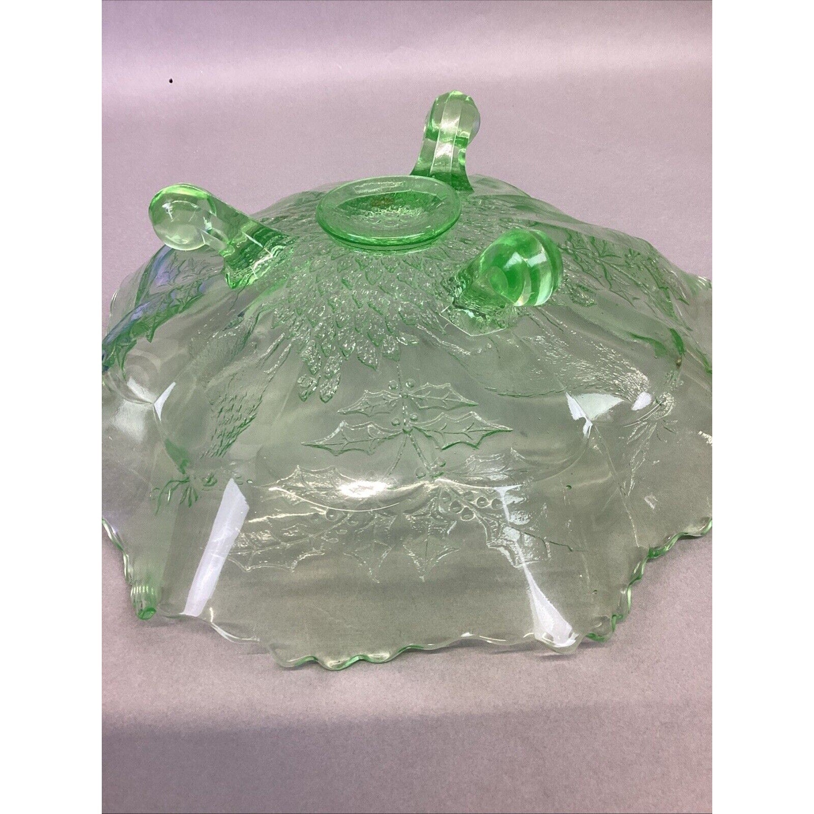 Vintage Fenton Stag and Holly Green Uranium Glass 3 Footed Bowl - 10x3.75”