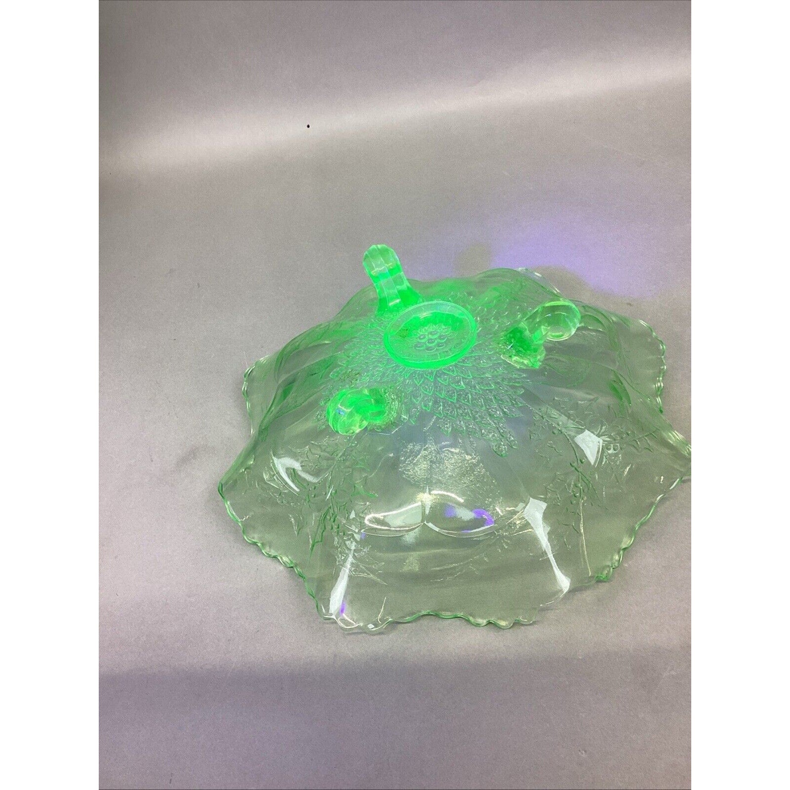 Vintage Fenton Stag and Holly Green Uranium Glass 3 Footed Bowl - 10x3.75”. In good condition. Glows under black light only.