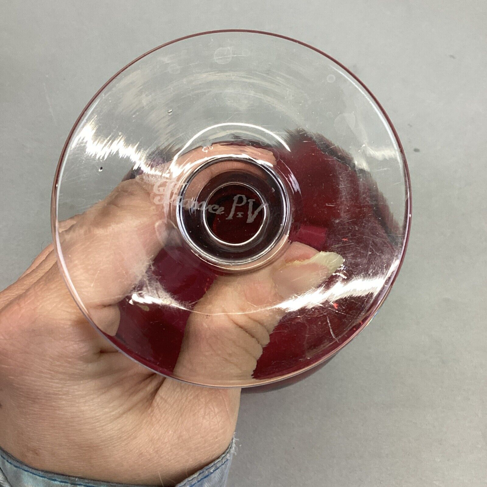 Vintage Glass Cranberry France PV Flower Vase Or Goblet. This item has a few imperfections. The glass rim has indentations, small chips. On the underside of the rim, there are 2 chips and there’s scratches on the base. This measures approximately 6”Hx2”D