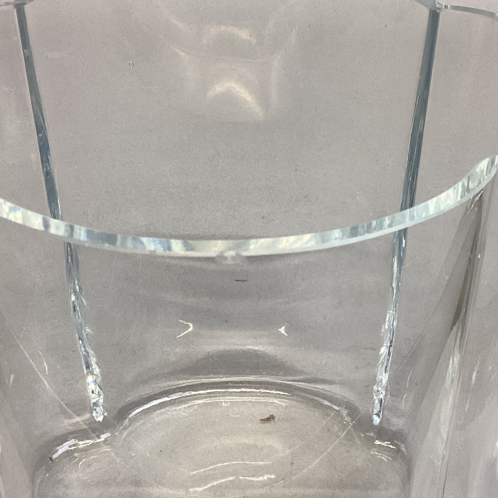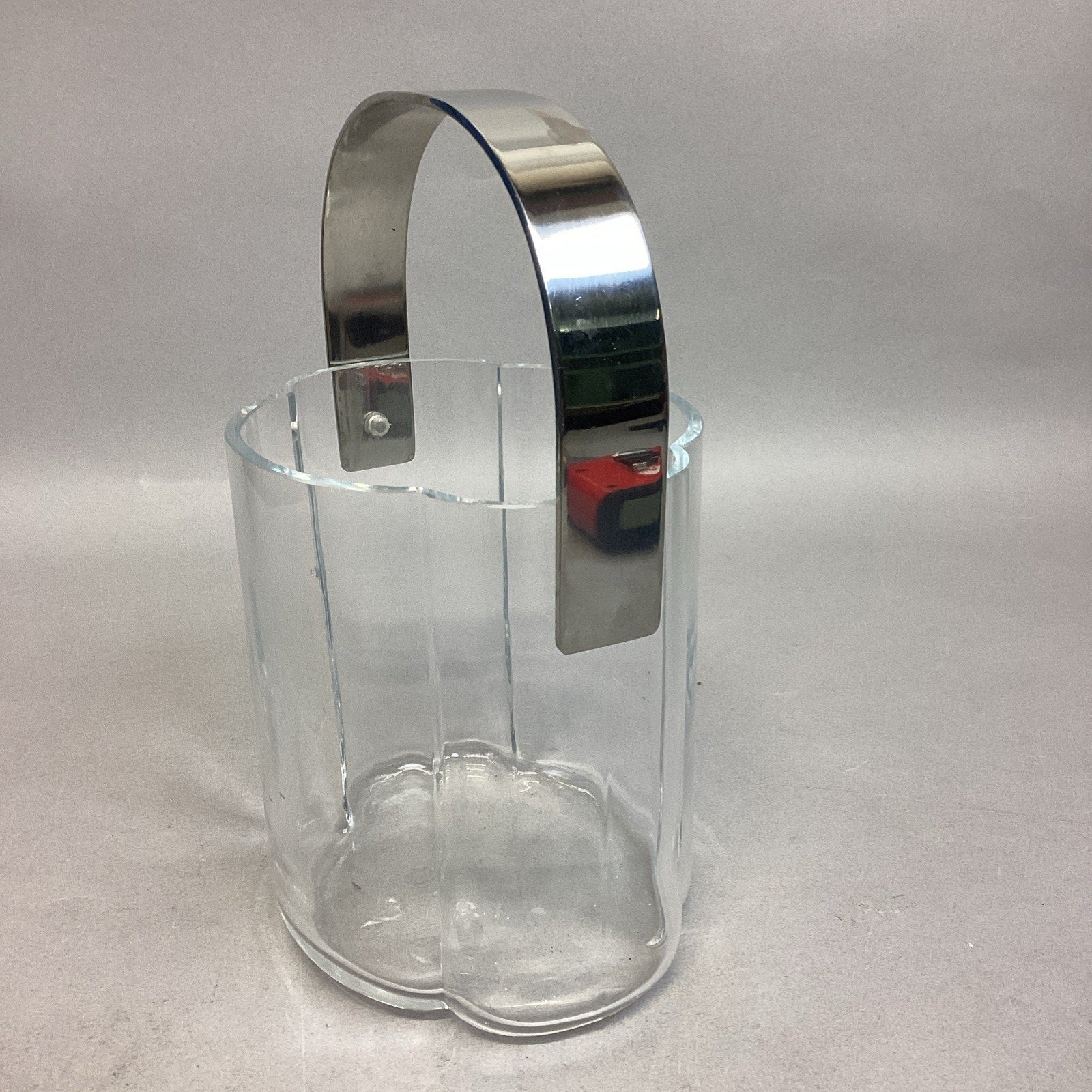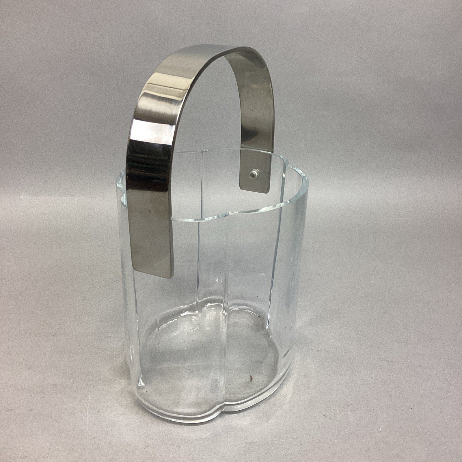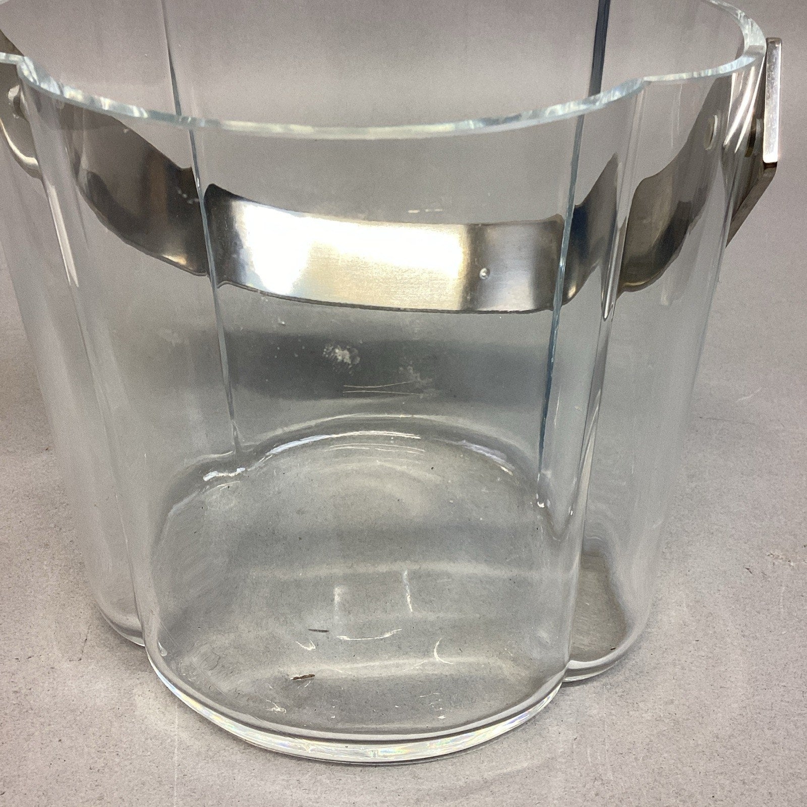 Vintage Glass Lobed Ice Bucket with Chrome Handle - 6x5x6”. In used condition. It has some imperfections including 1 small chip on the top edge. It has some smudges and stains in the glass.