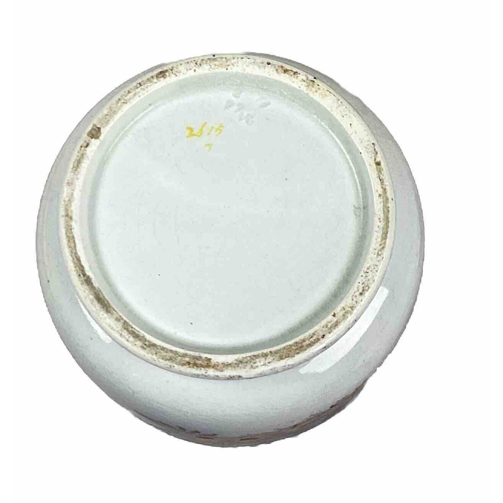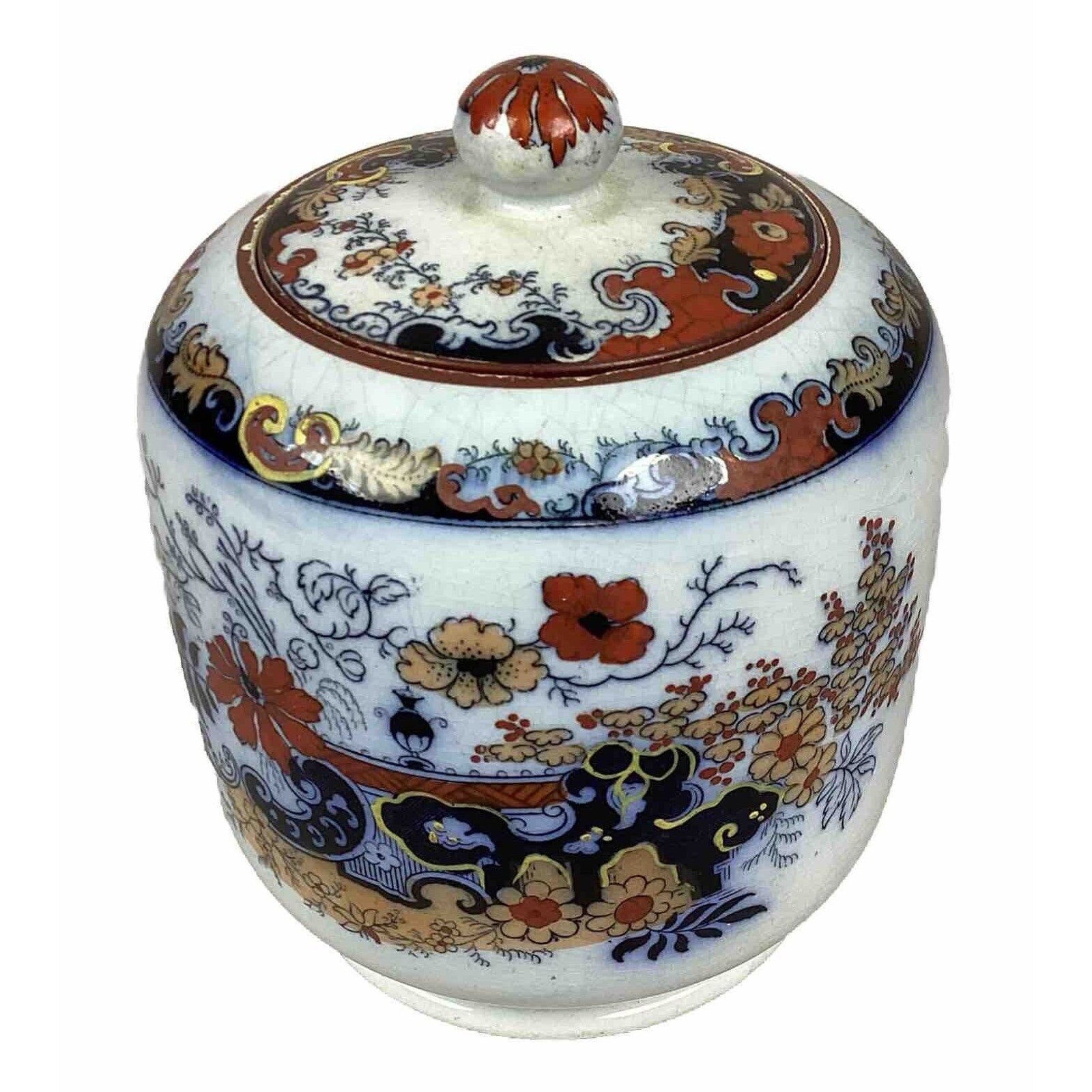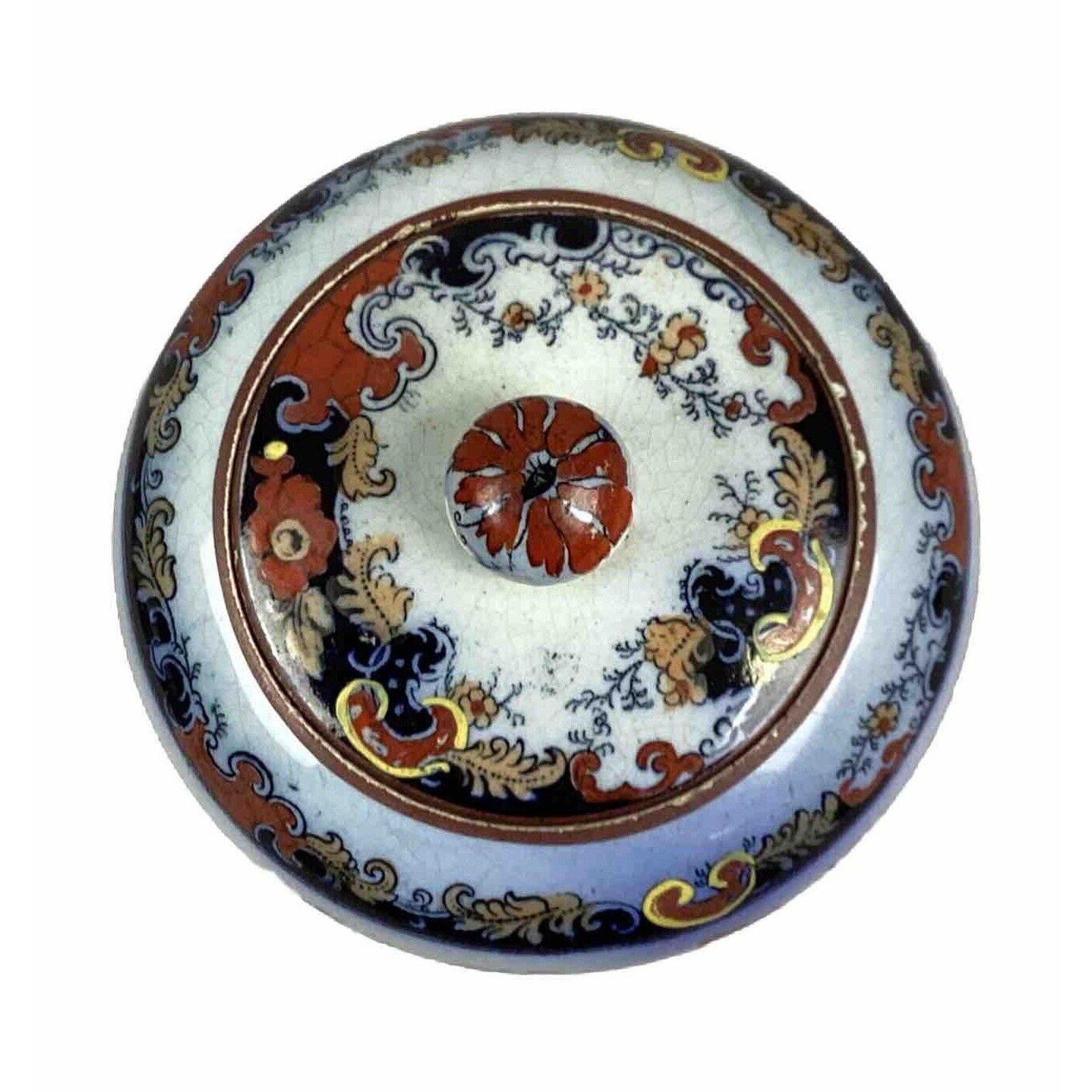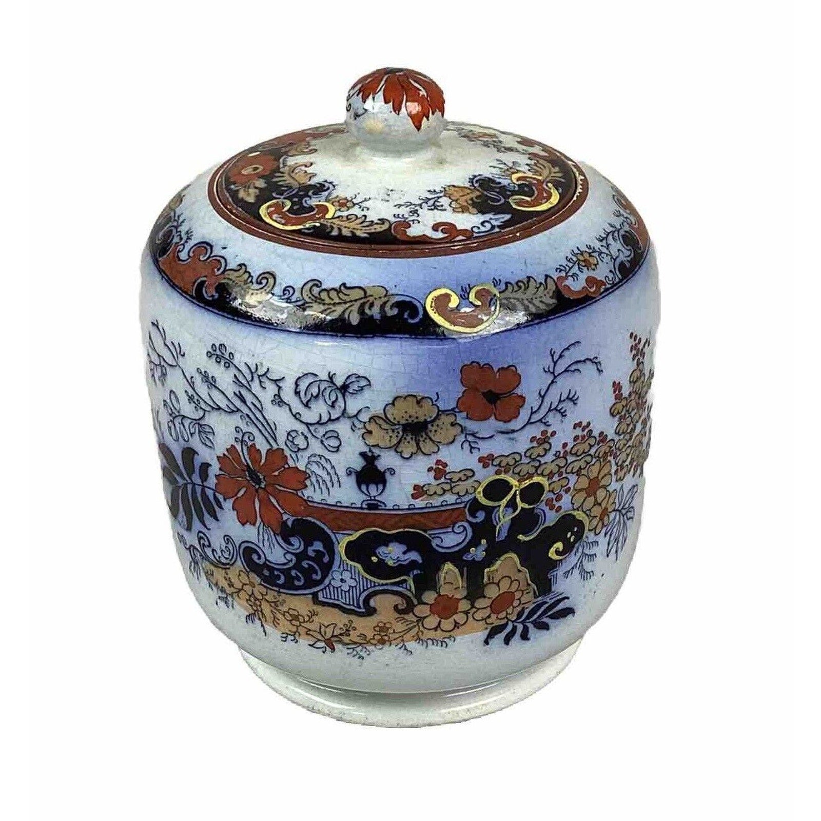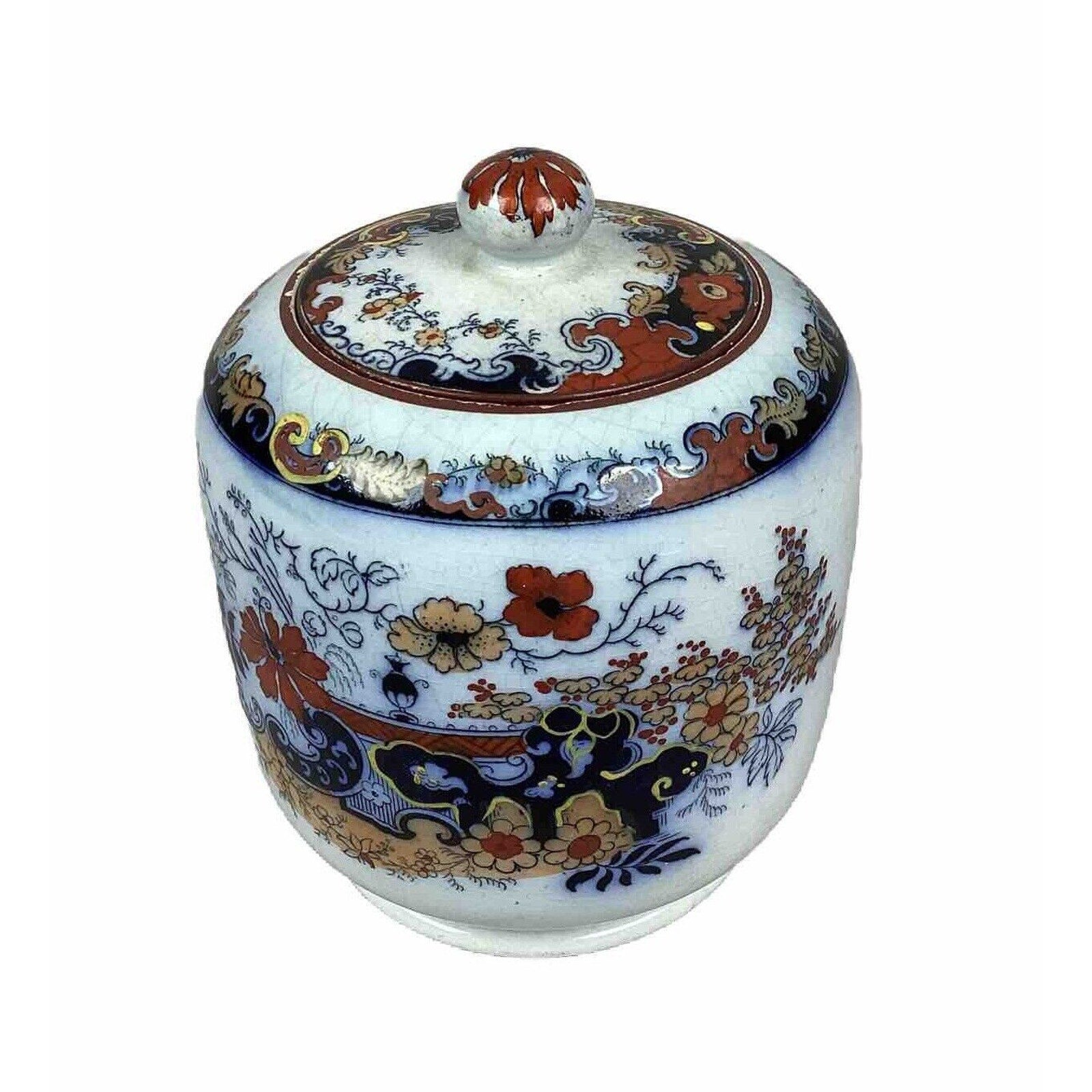 This listing is for a vintage Japanese Imari Jar with a lid. I believe this is made out of porcelain. It measures approximately 5” high to the top of the ball on the lid and 4”W