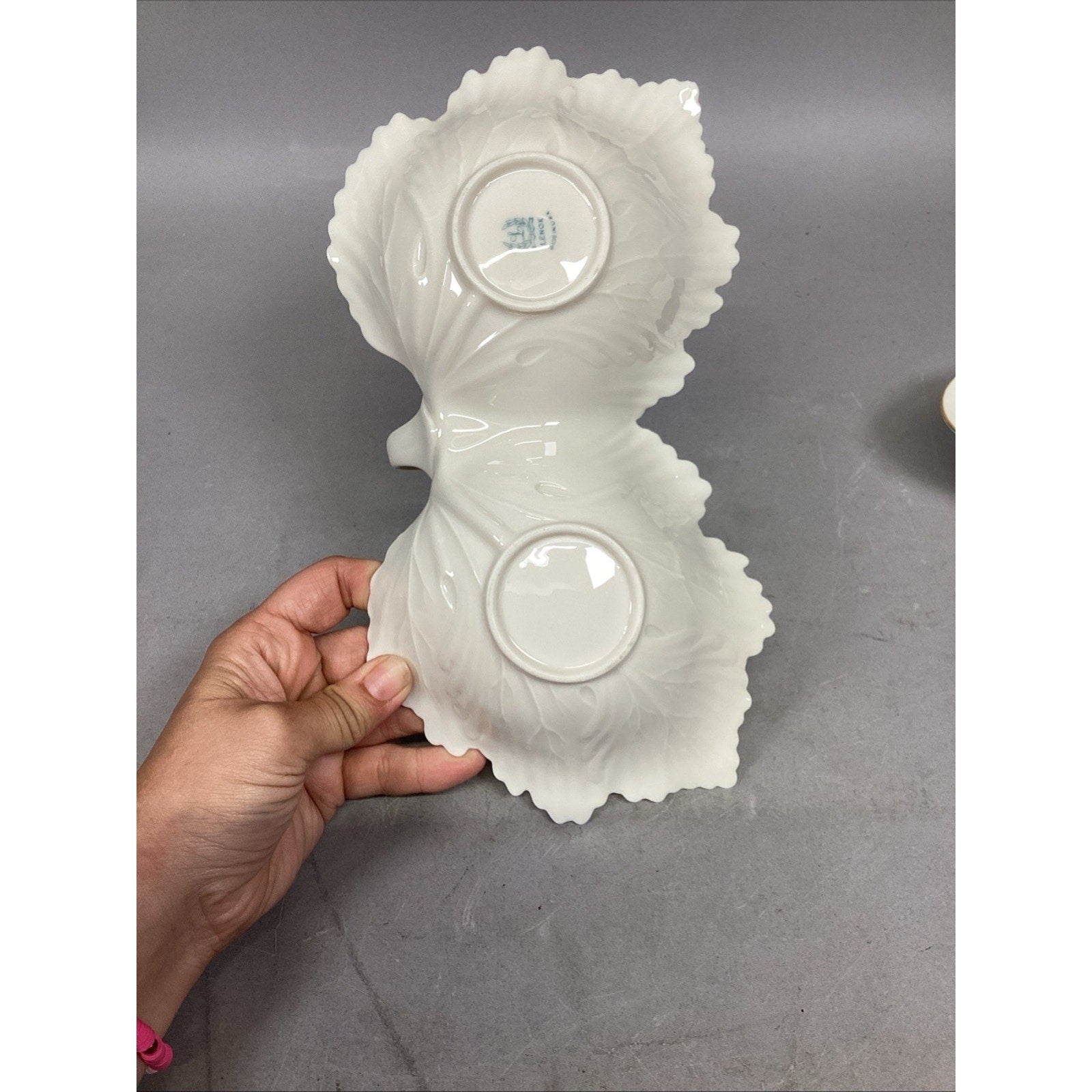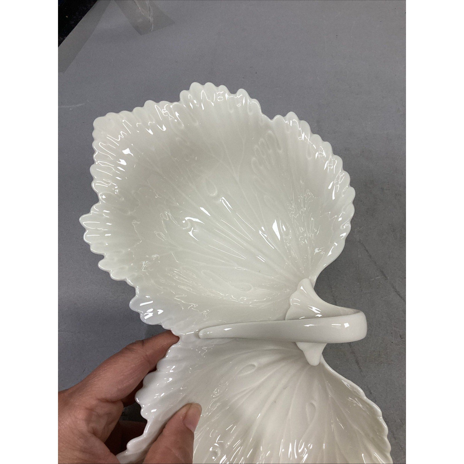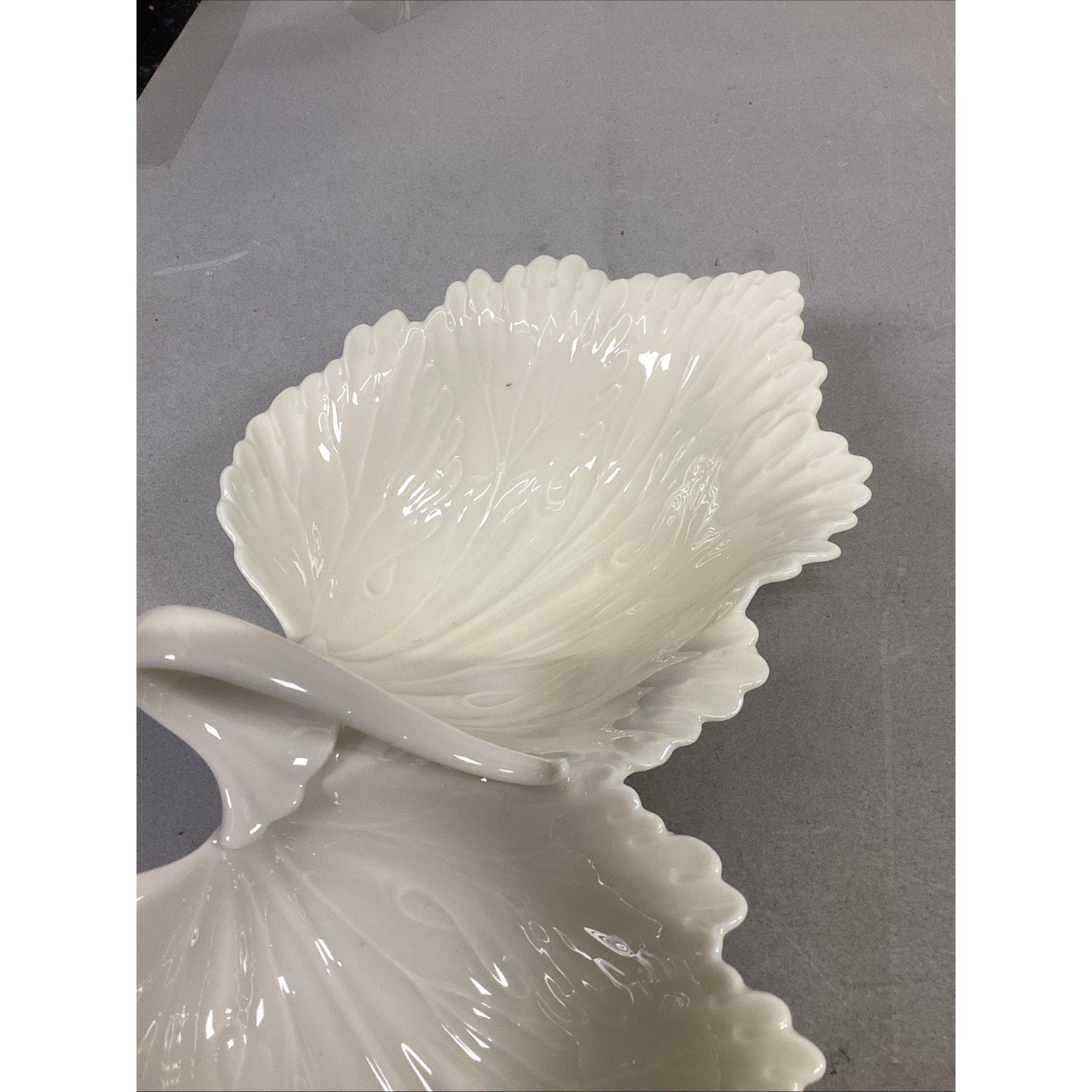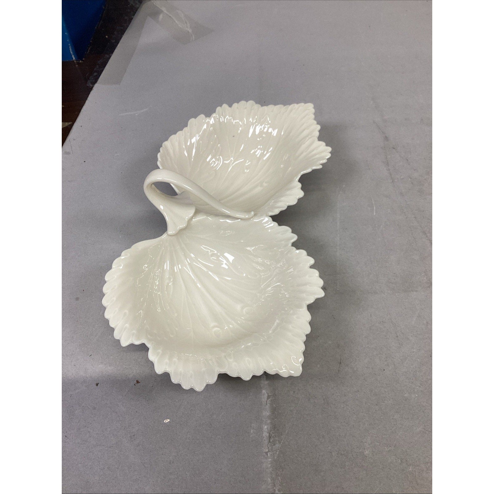 1. Double leaf candy nut dish. In good condition. Has a couple stains. No chips or cracks. This measures 10.5”Lx3”H. Each individual bowl measures 5.5x5”
