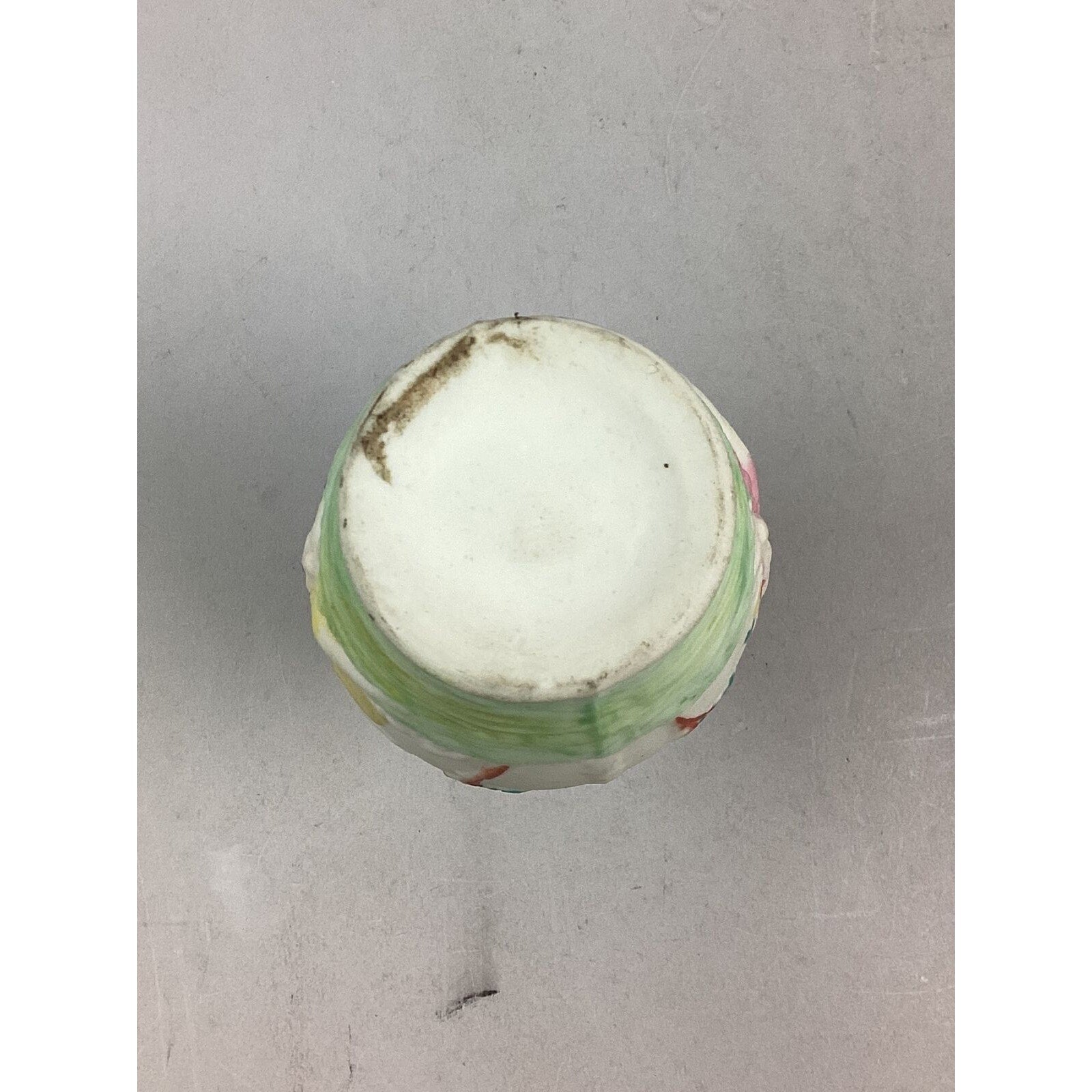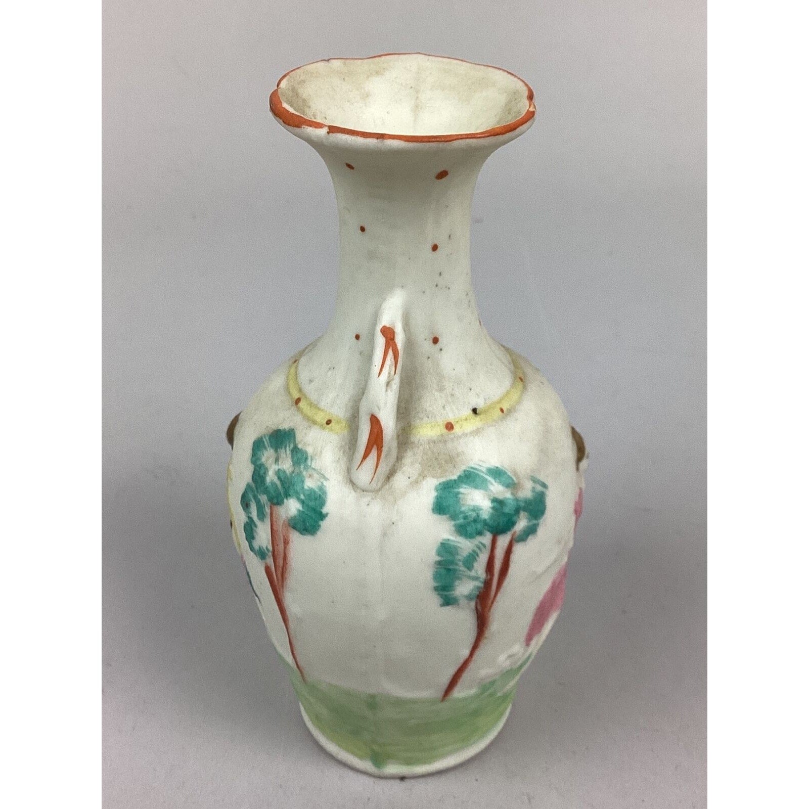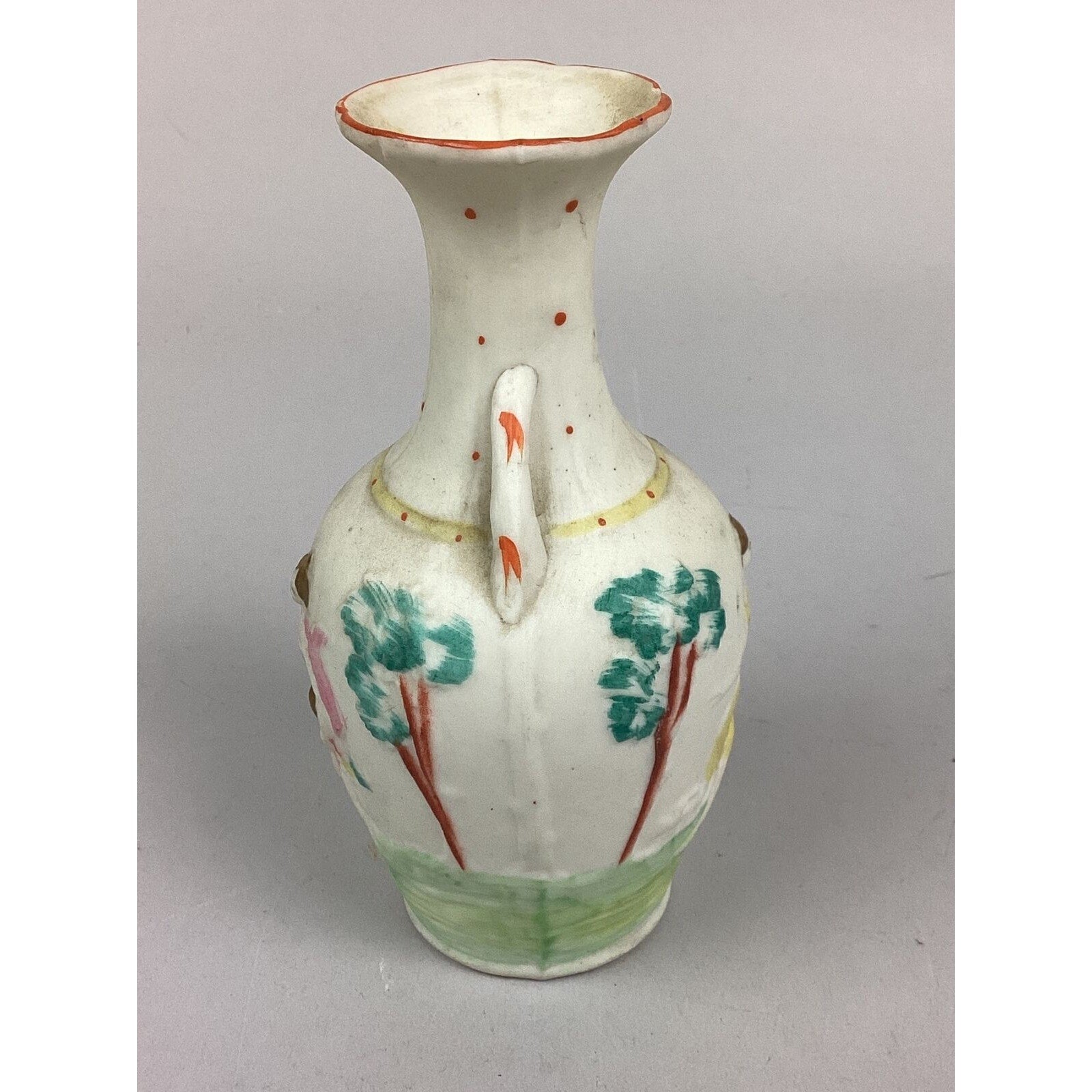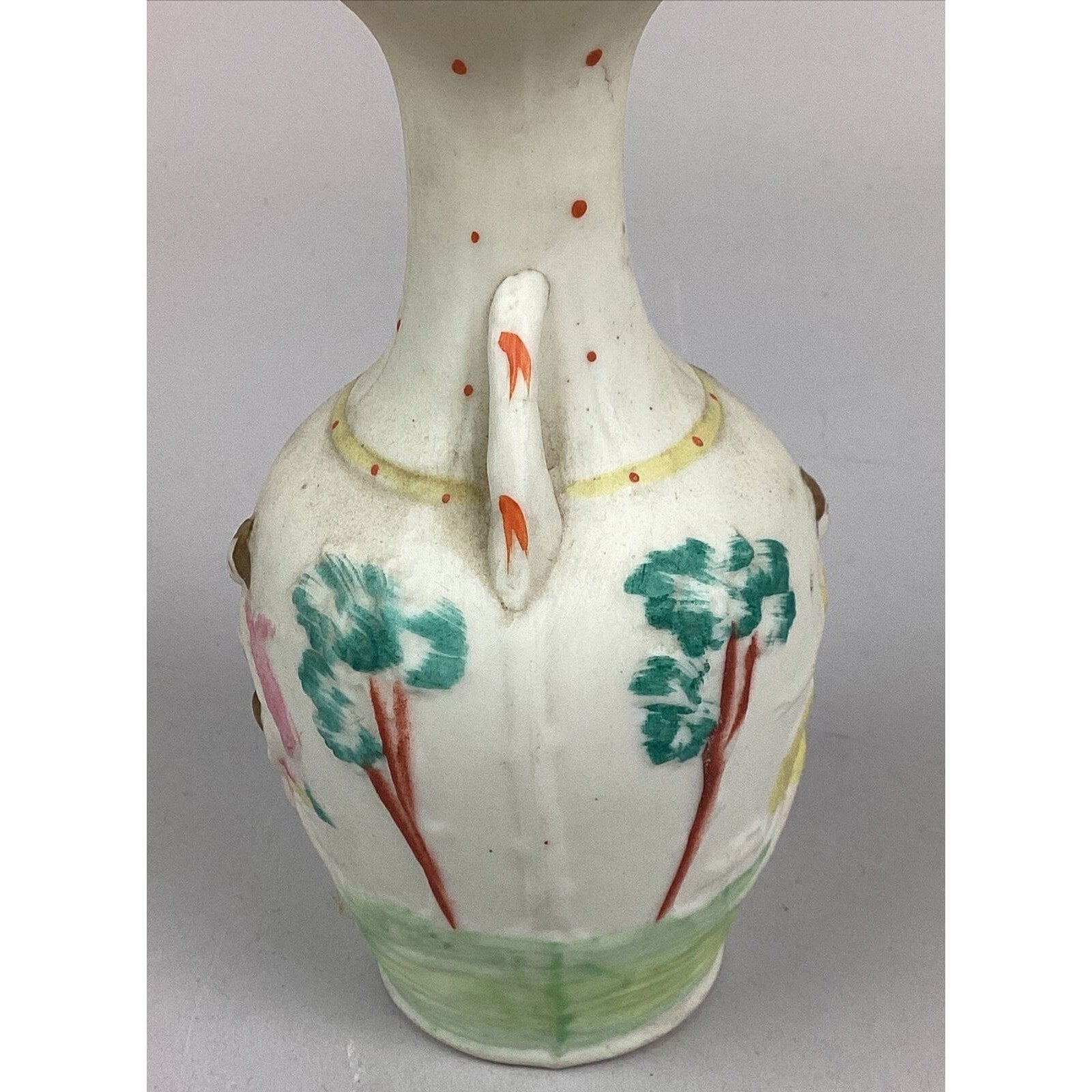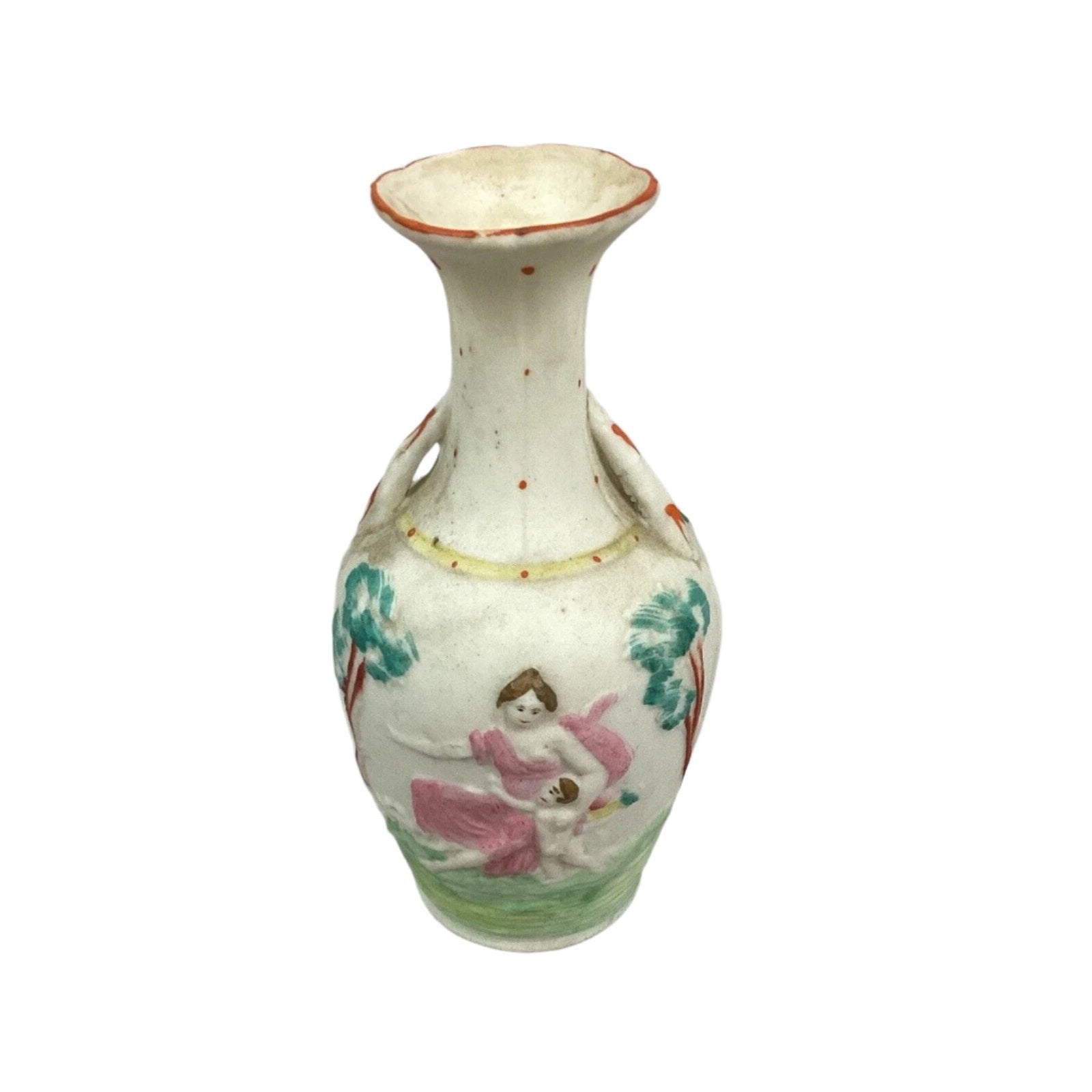 This listing is for a vintage ceramic vase featuring an outdoor scene with a mother and son picture on 2 sides of the vase.