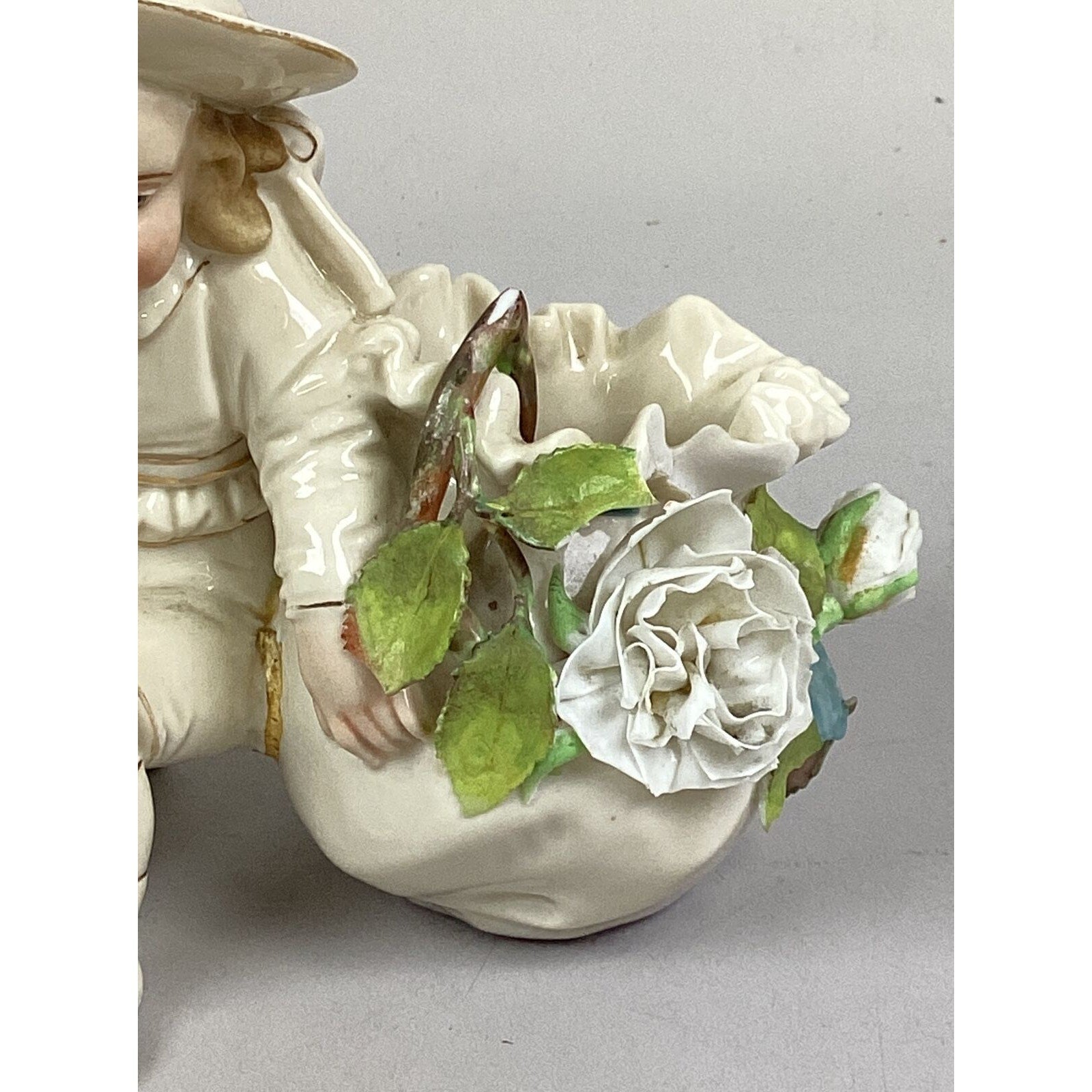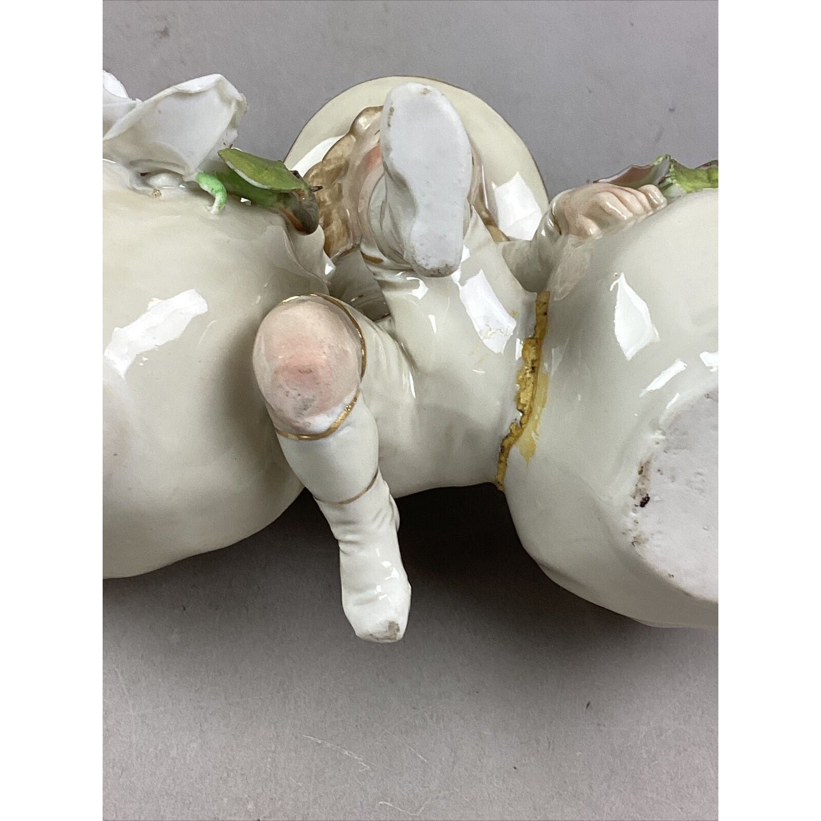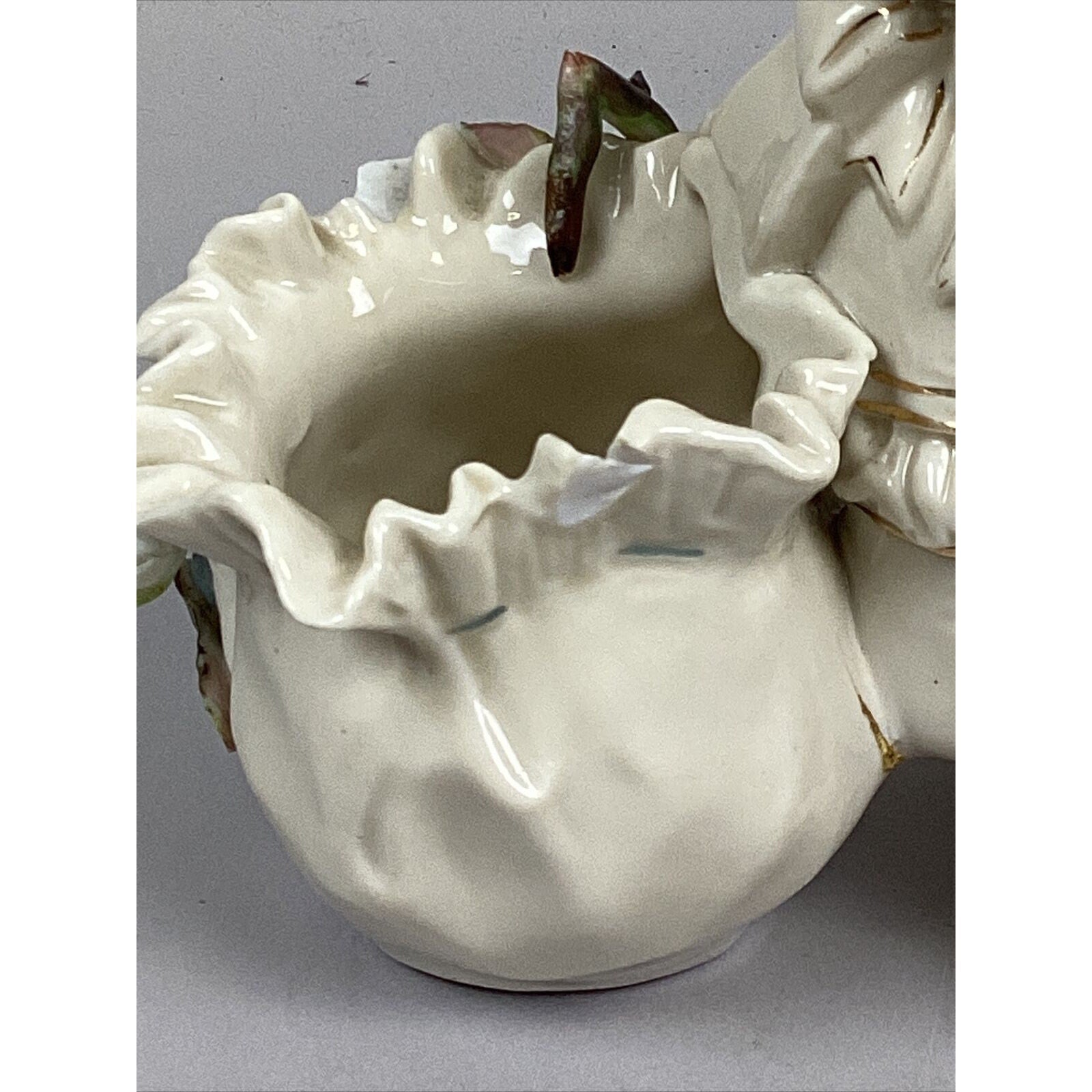 This is a vintage porcelain figurine of a child and 2 flower vases. There’s a small chip on the stem of the leaf on the right side. There’s also a small chip on the edge of the vase on the back side.