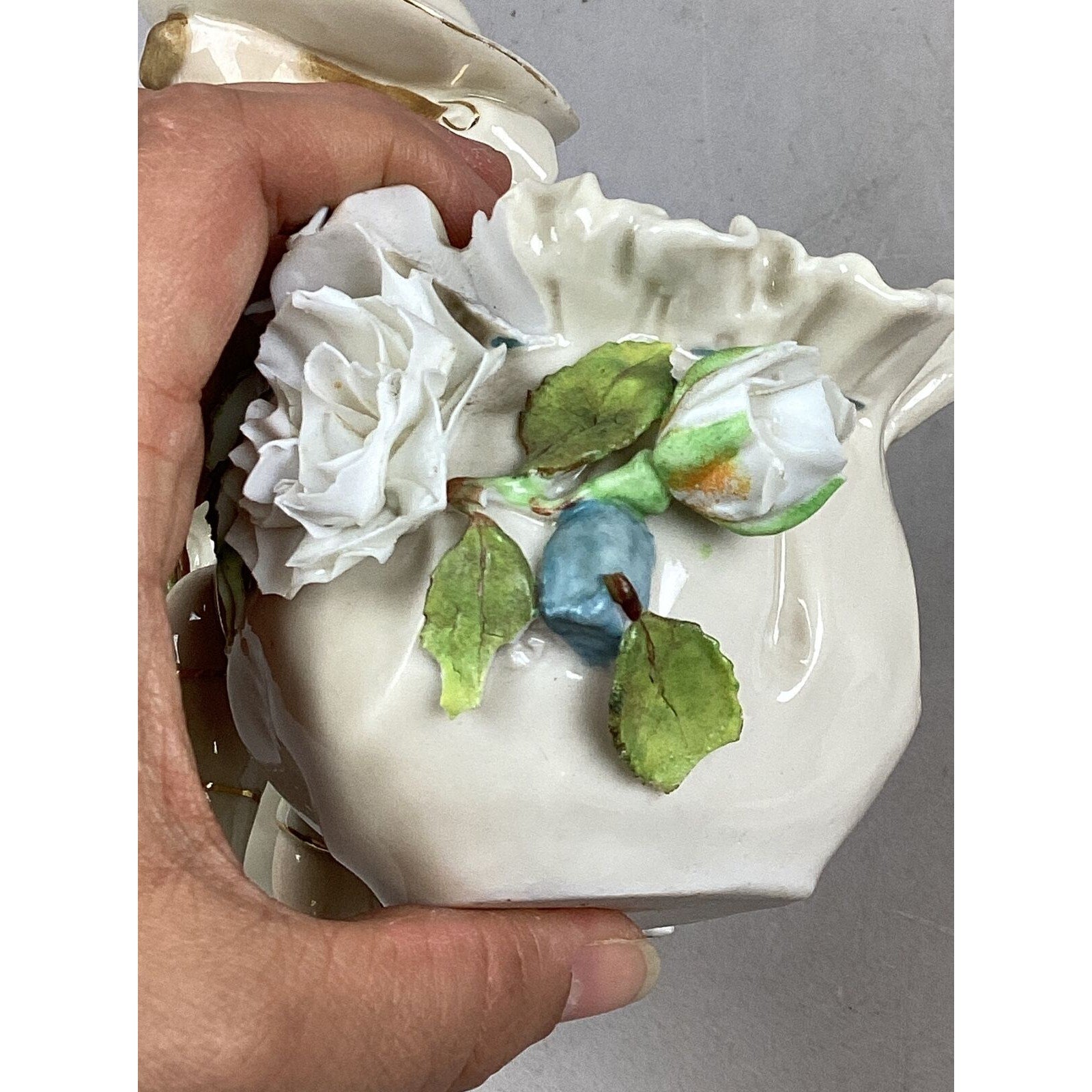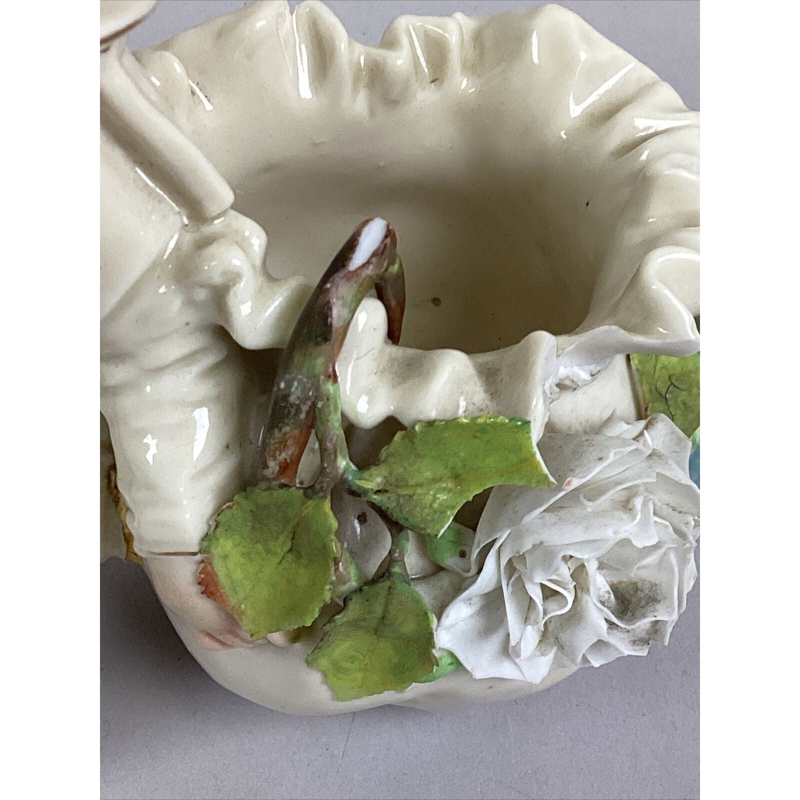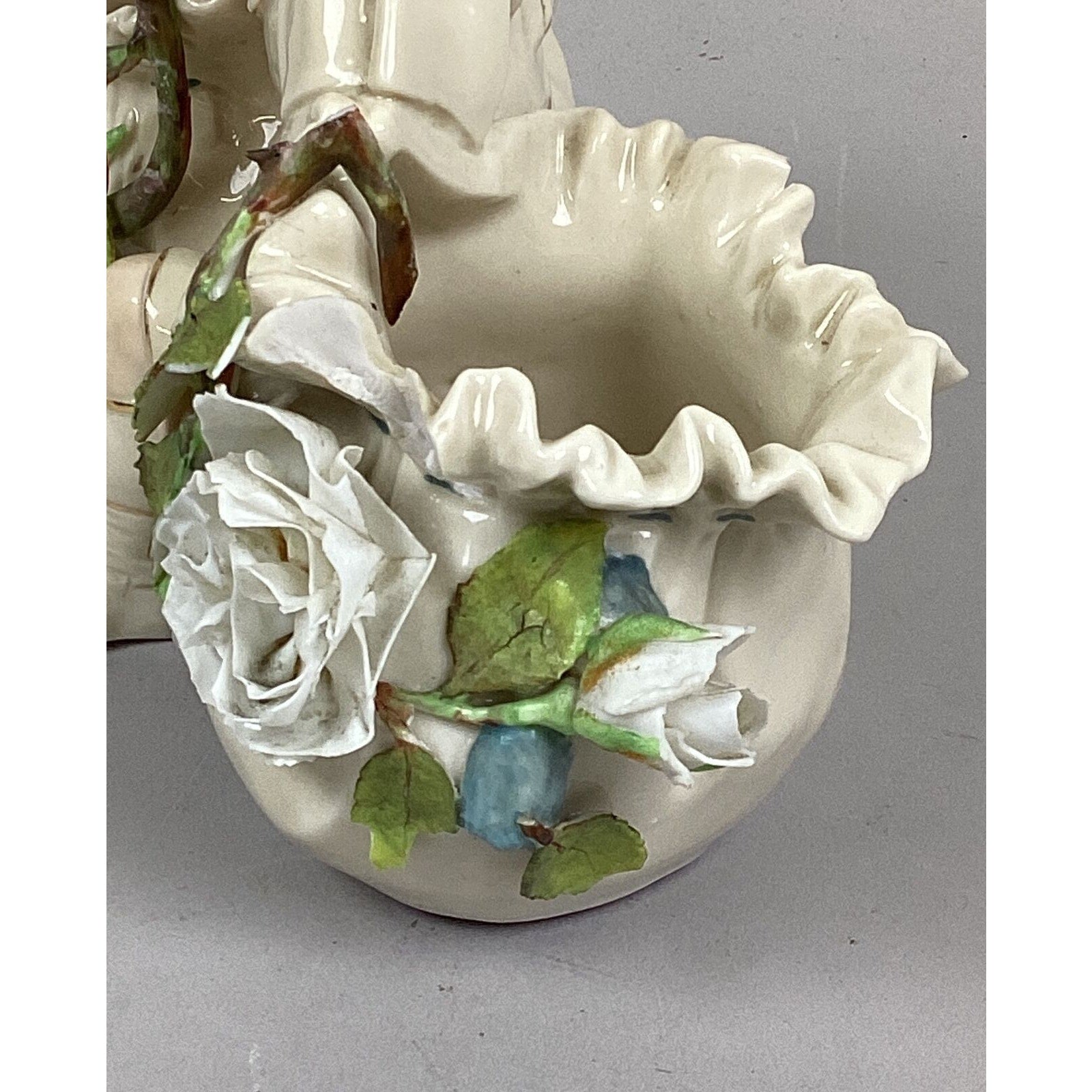 This is a vintage porcelain figurine of a child and 2 flower vases. There’s a small chip on the stem of the leaf on the right side. There’s also a small chip on the edge of the vase on the back side.