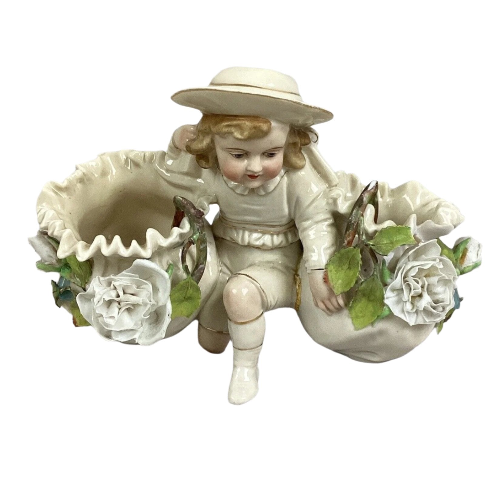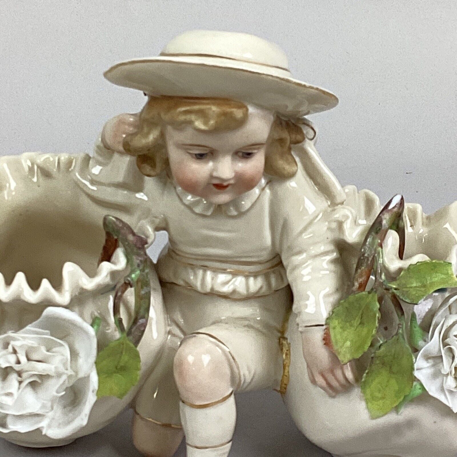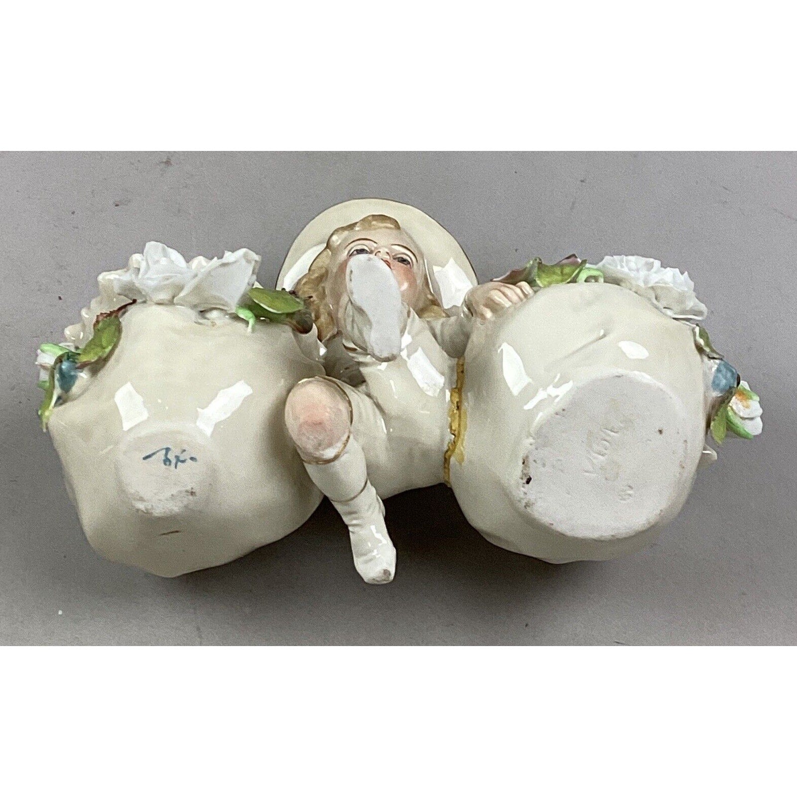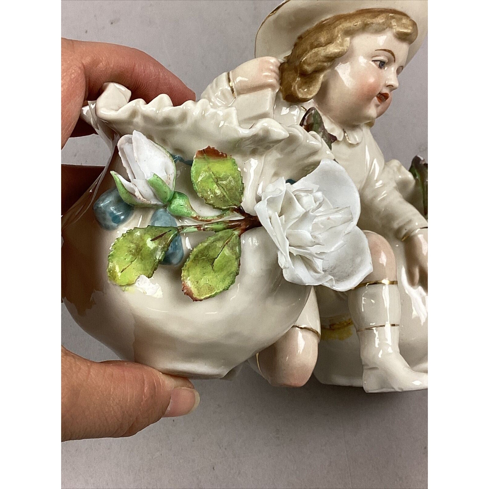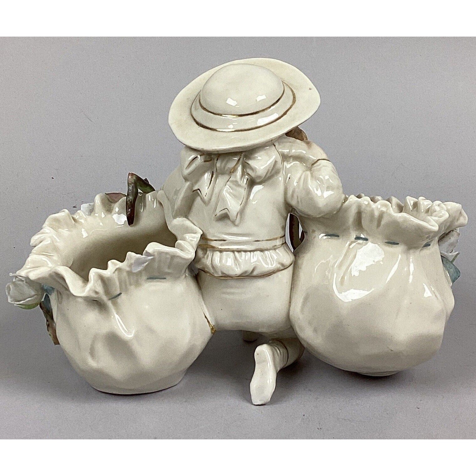 Vintage Porcelain Child Figurine With 2 Flower Vases - 6”