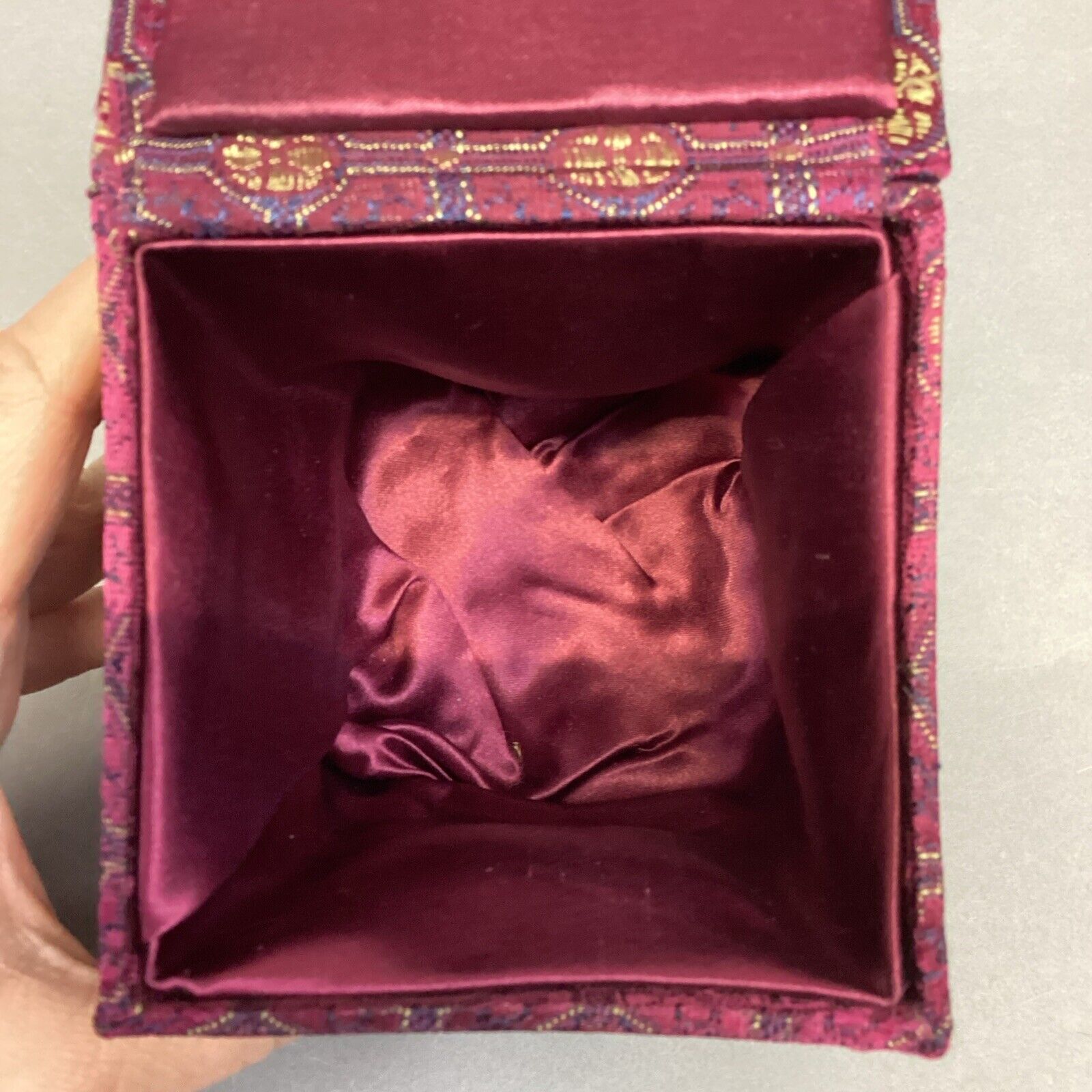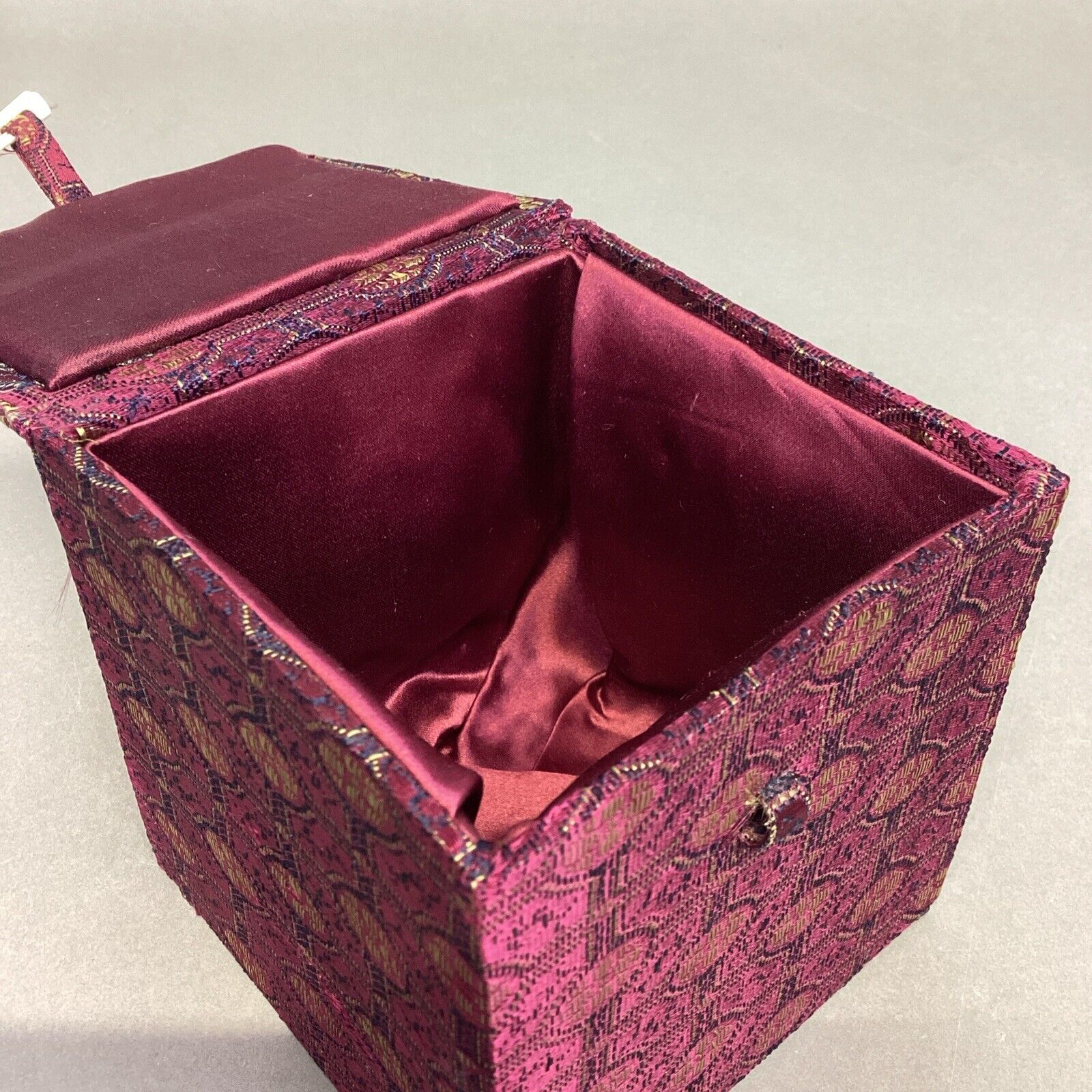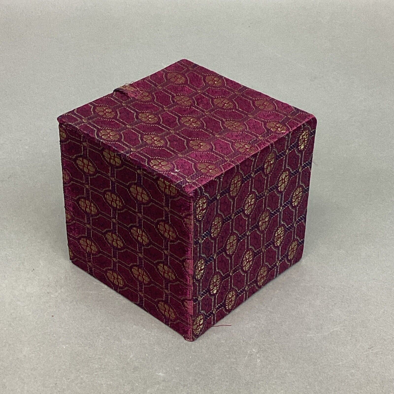 Vintage Purple Fabric Covered Jewelry Or Trinket Box W/ Ivory Clasp - 3.5”Hx3.5”D. In good condition. The exterior has purple fabric while the interior has a purple silky material. #66-050.