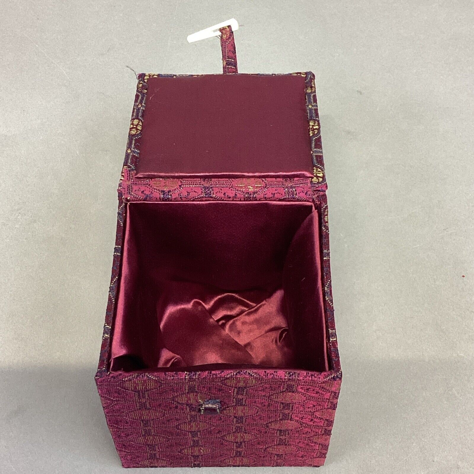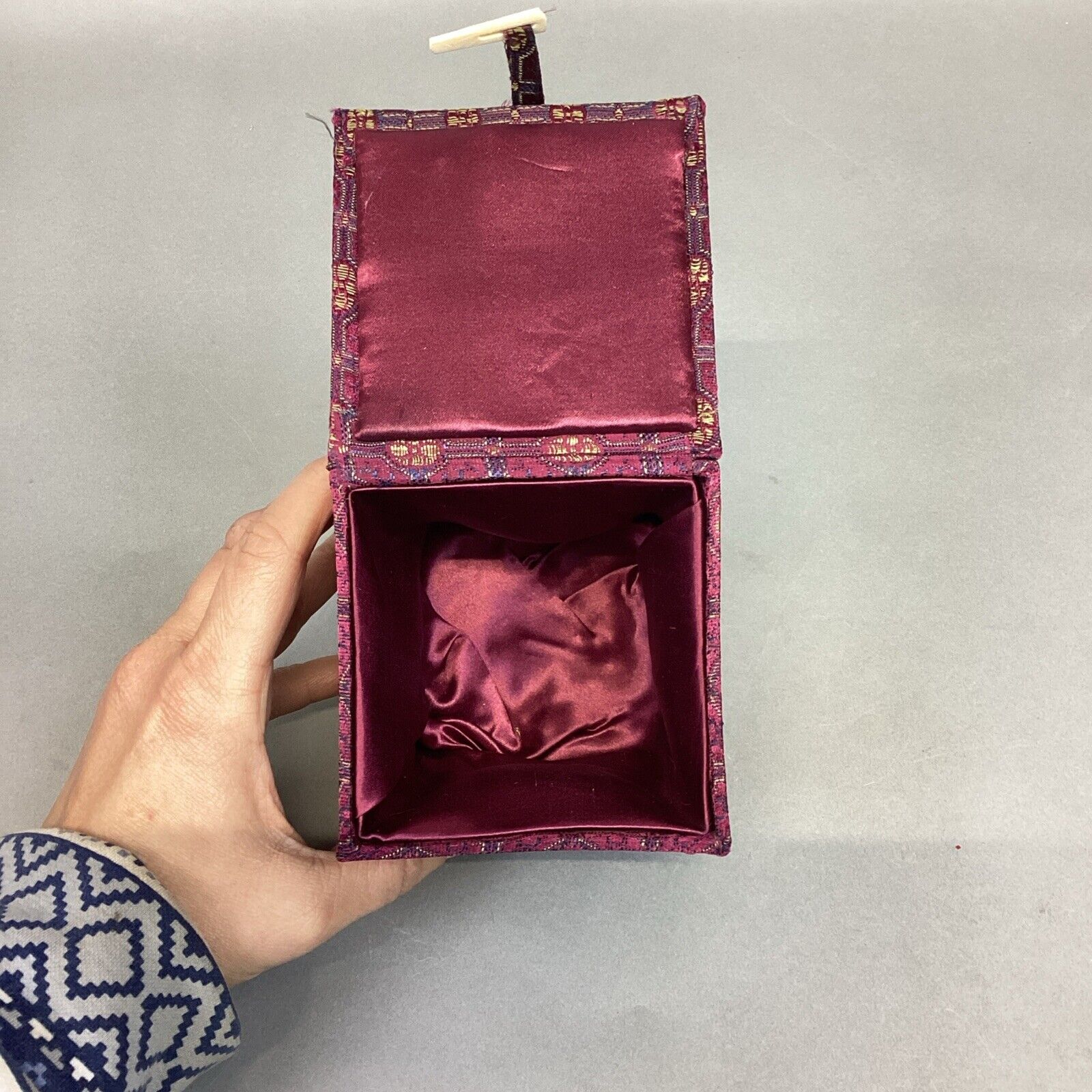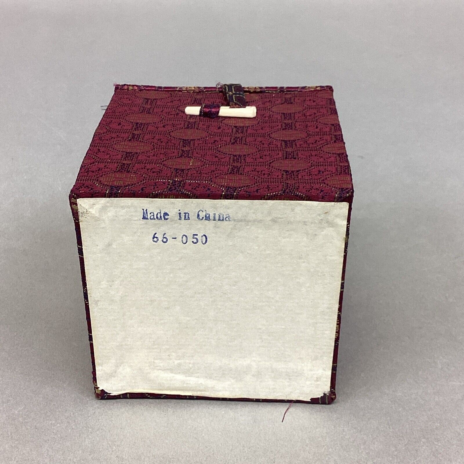 Vintage Purple Fabric Covered Jewelry Or Trinket Box W/ Ivory Clasp - 3.5”Hx3.5”D. In good condition. The exterior has purple fabric while the interior has a purple silky material. #66-050.