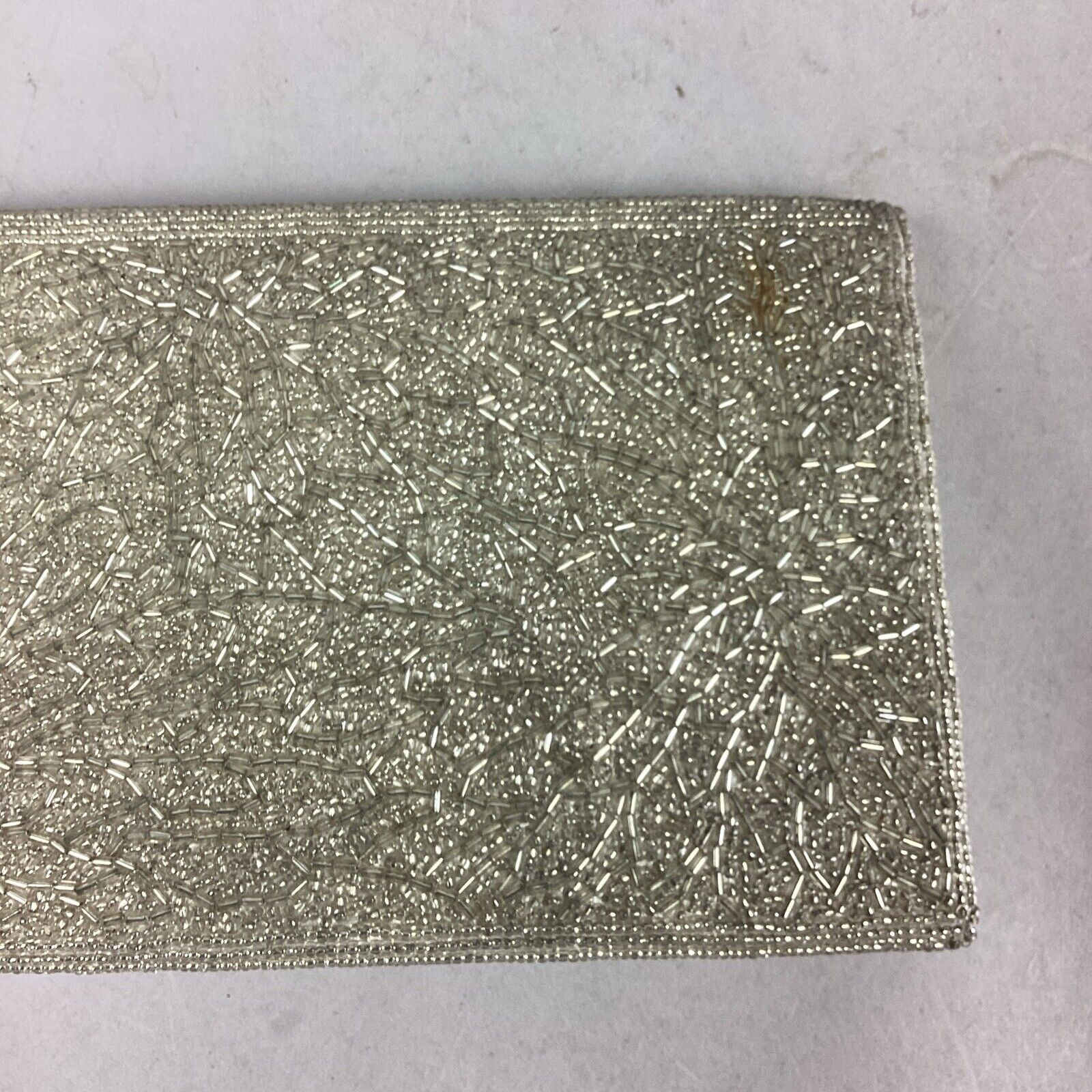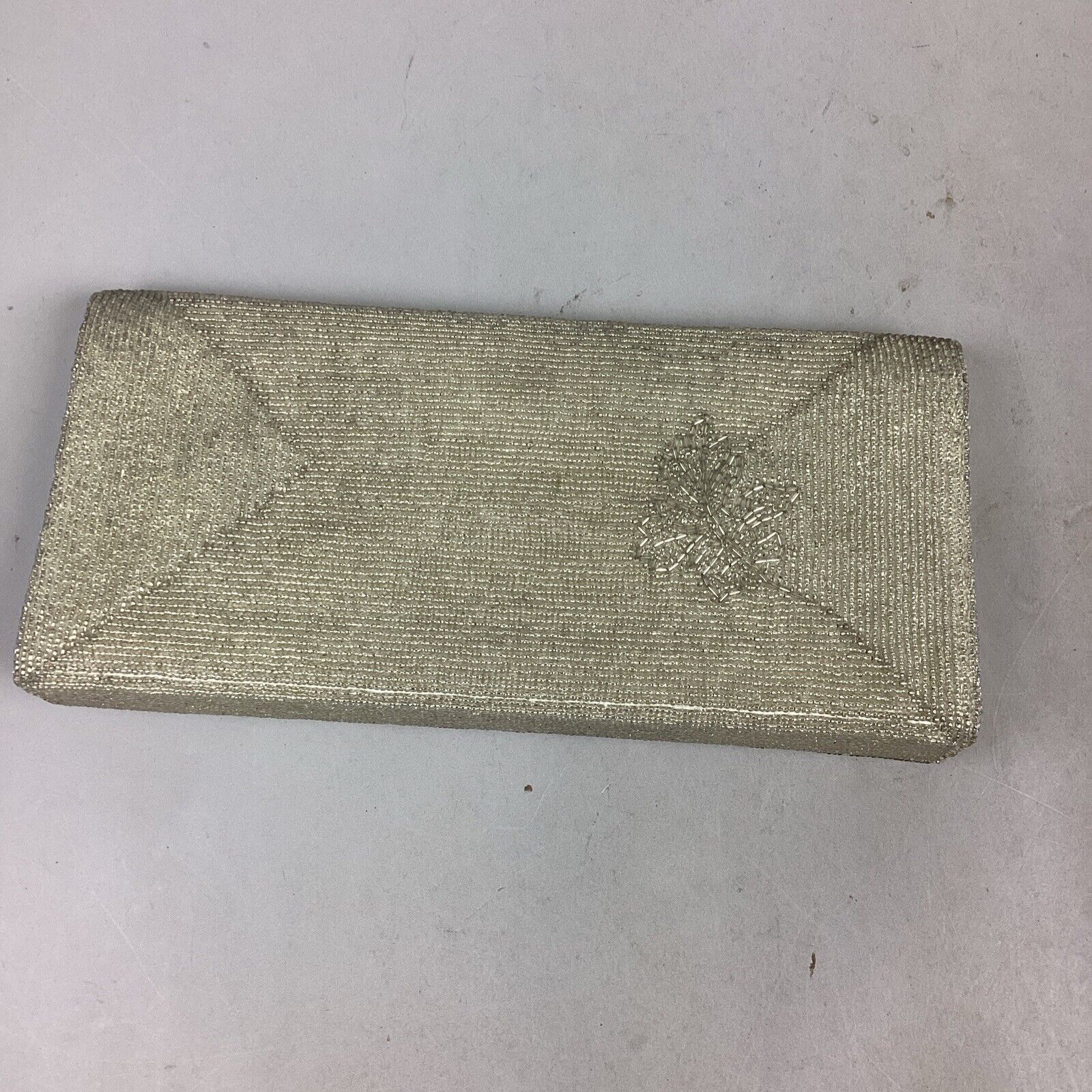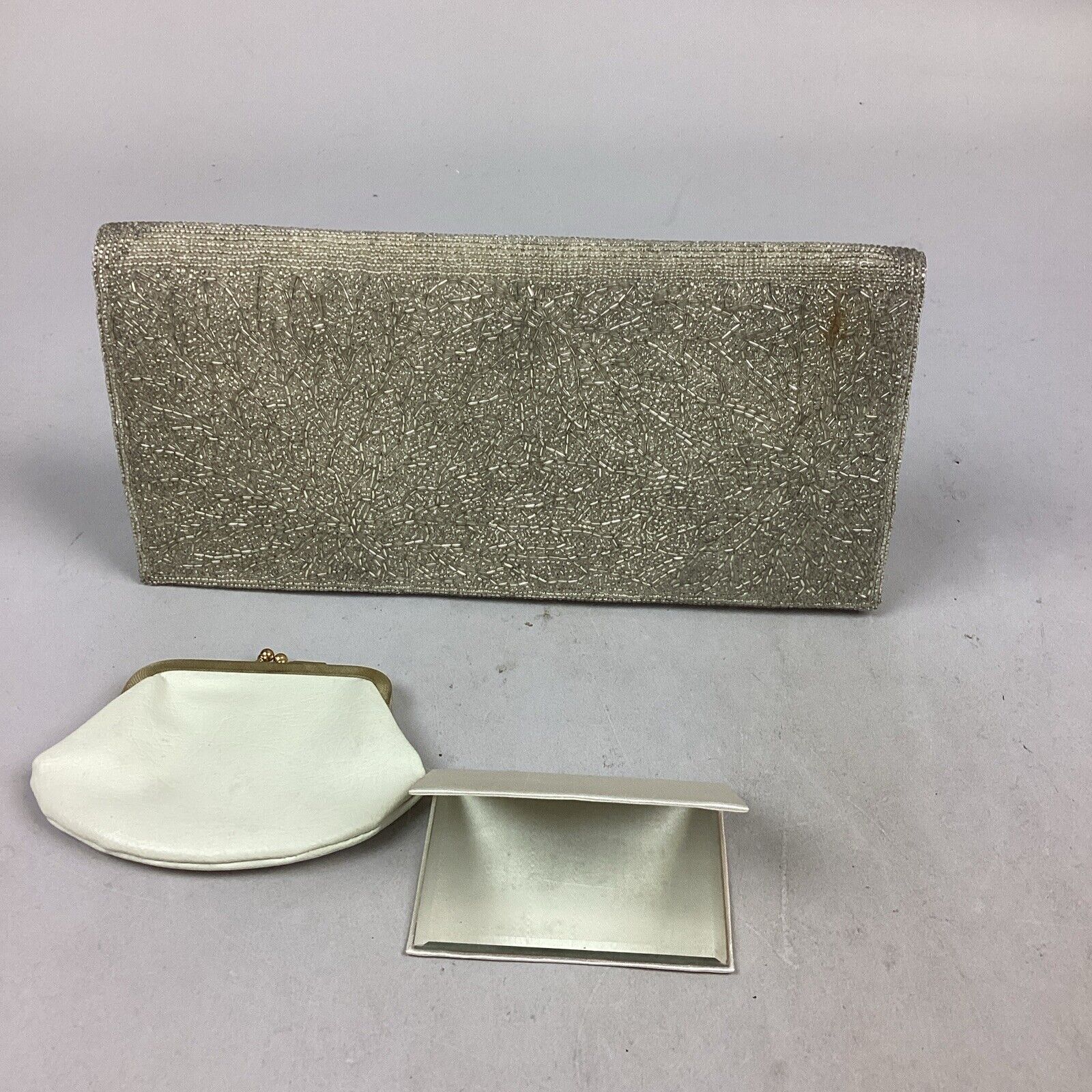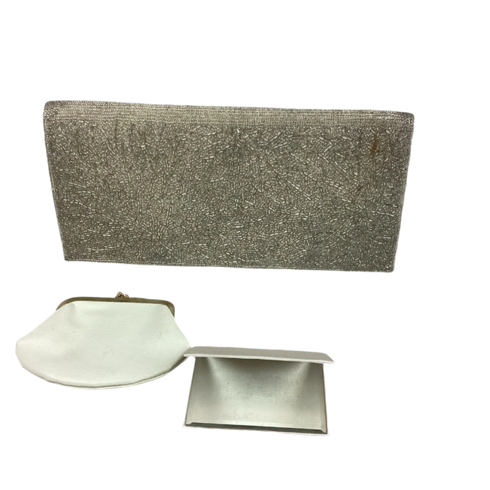 This clutch is unmarked. The exterior is in very good condition. It looks like there’s 2 flowers on the front in silver. It includes a change purse/coin pouch and a small mirror in a case. The mirror seems to be peeling off the case. There are a few stains on the interior