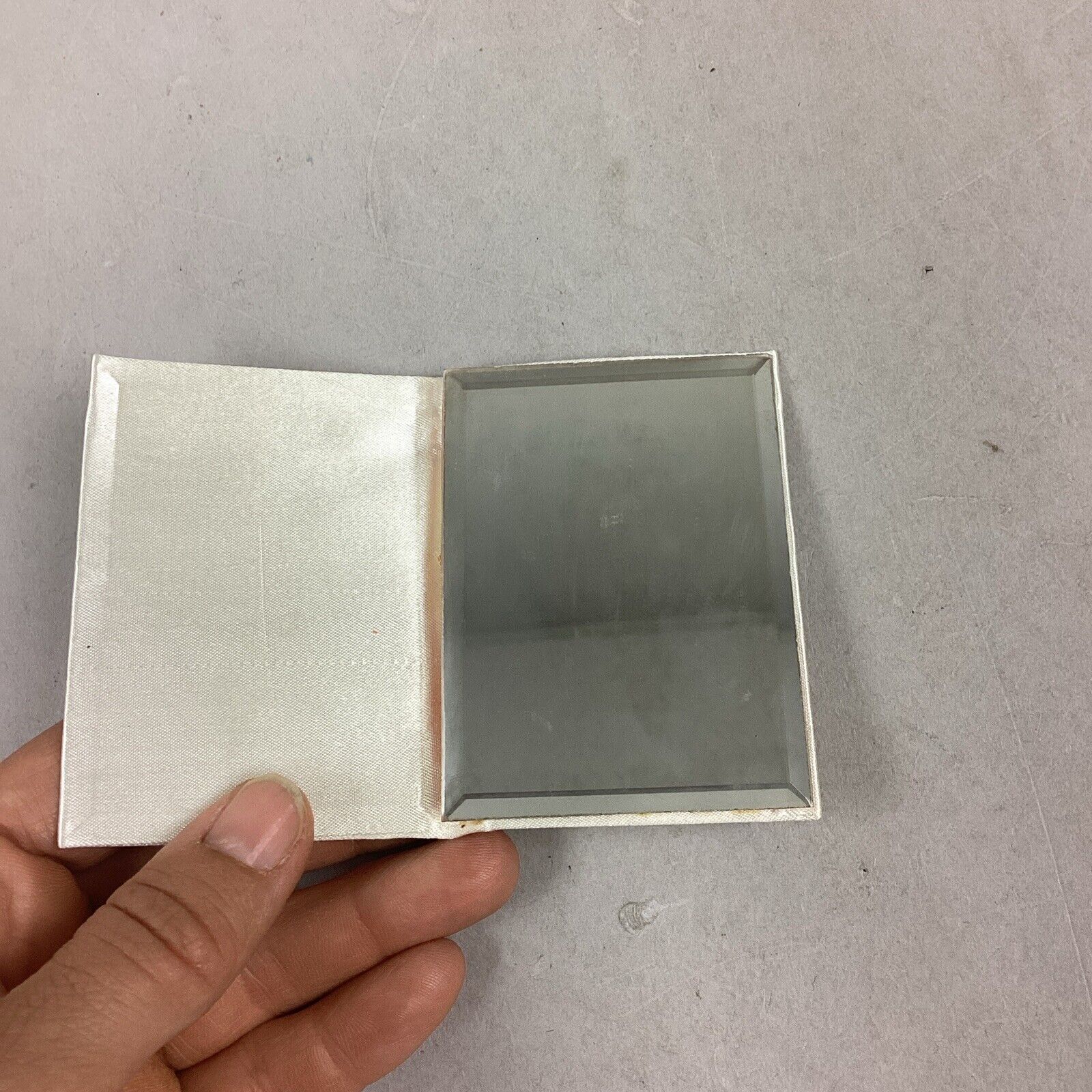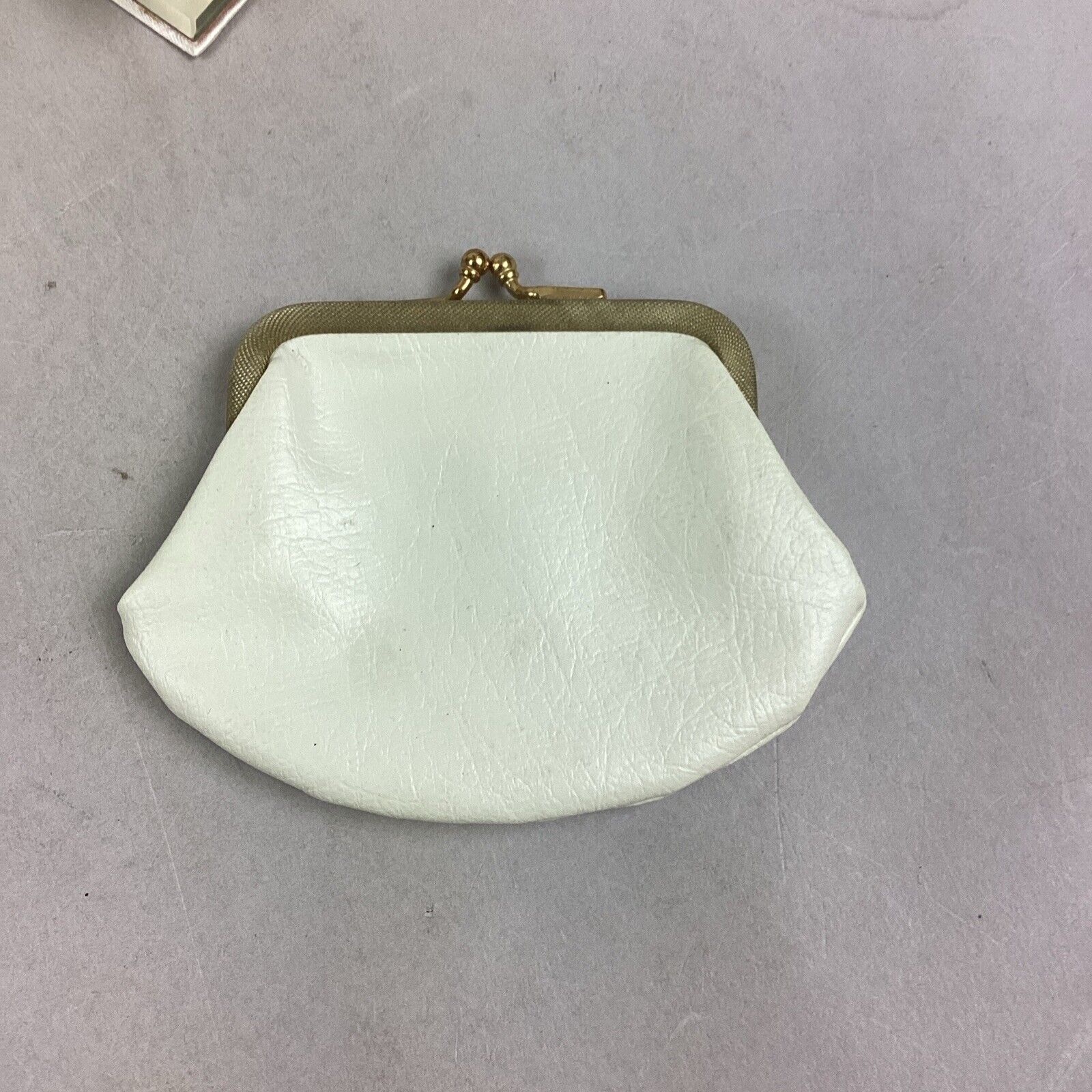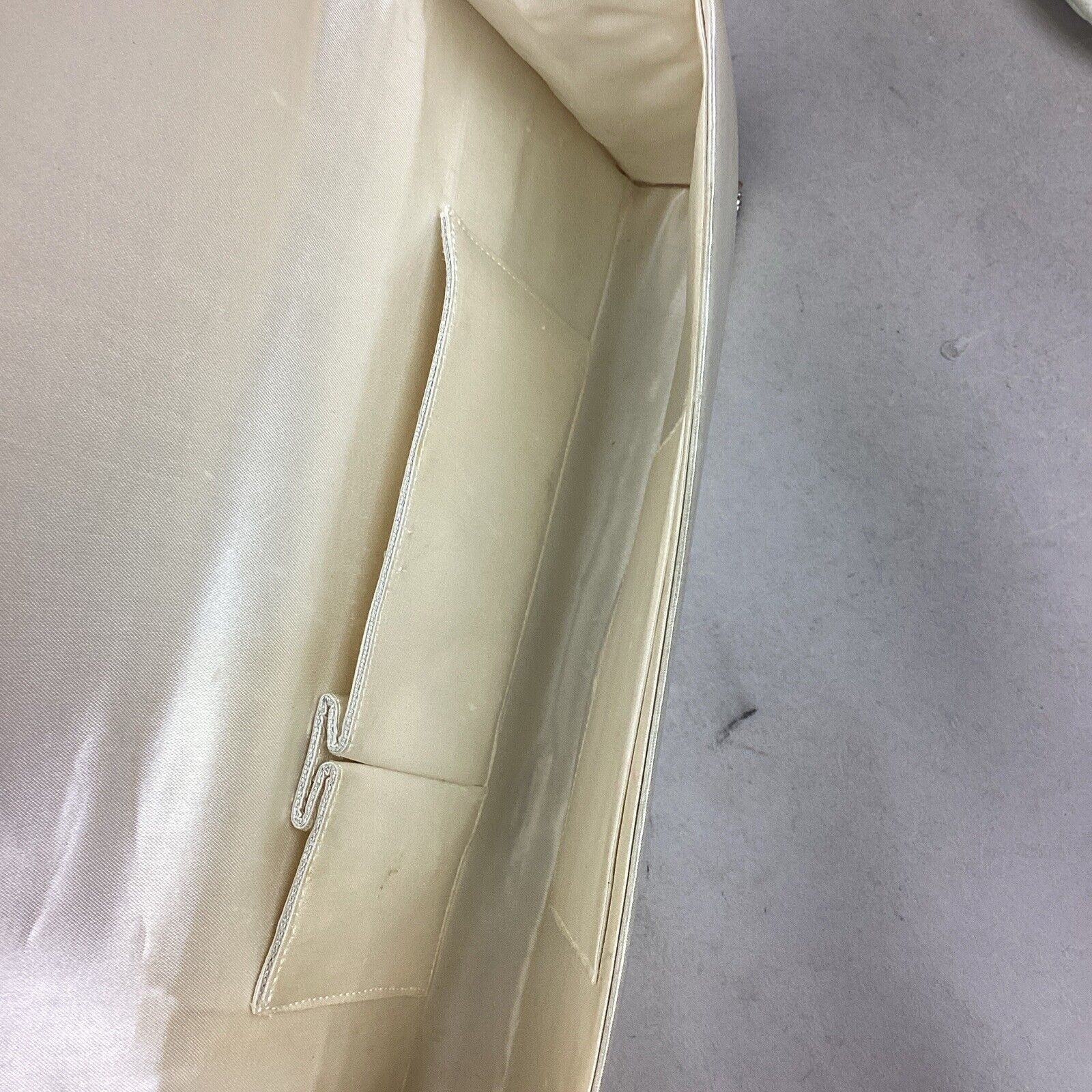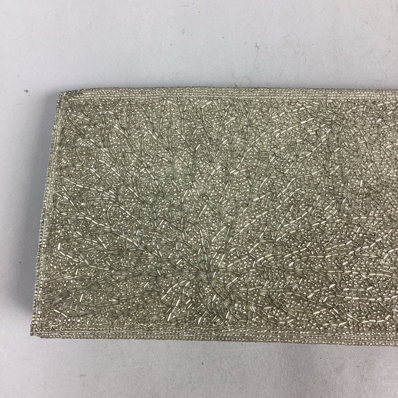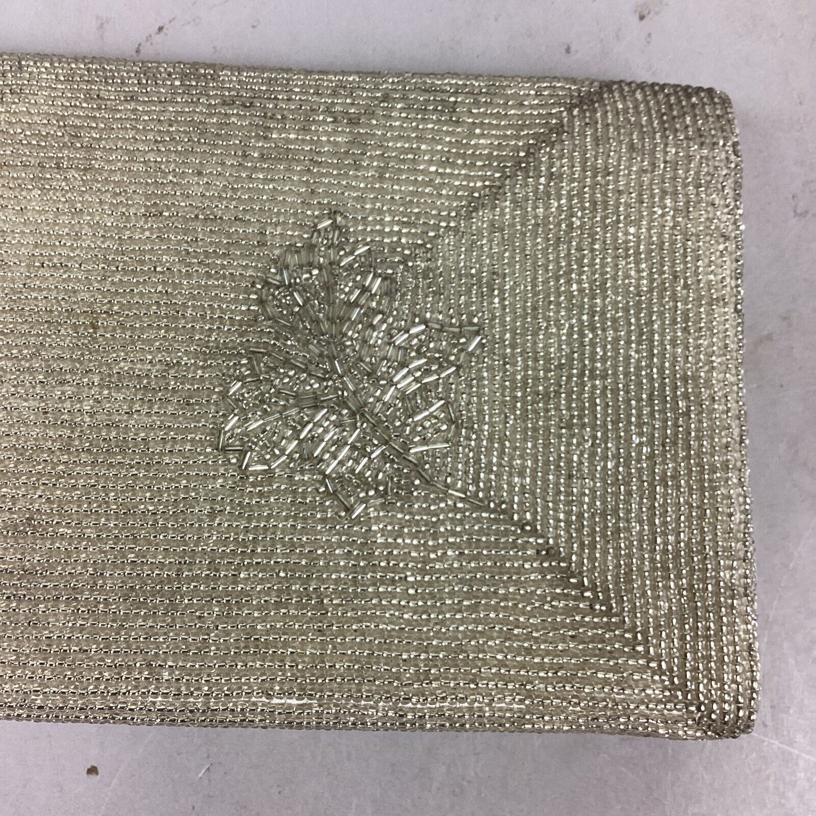 This clutch is unmarked. The exterior is in very good condition. It looks like there’s 2 flowers on the front in silver. It includes a change purse/coin pouch and a small mirror in a case. The mirror seems to be peeling off the case. There are a few stains on the interior
