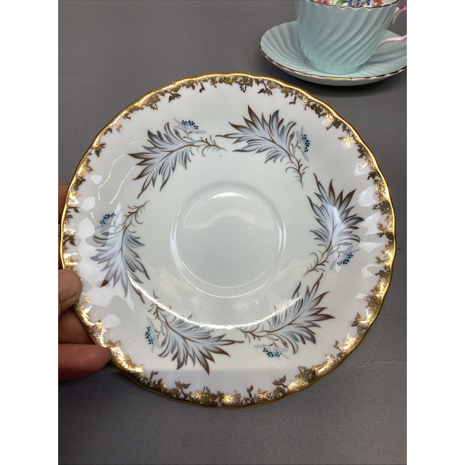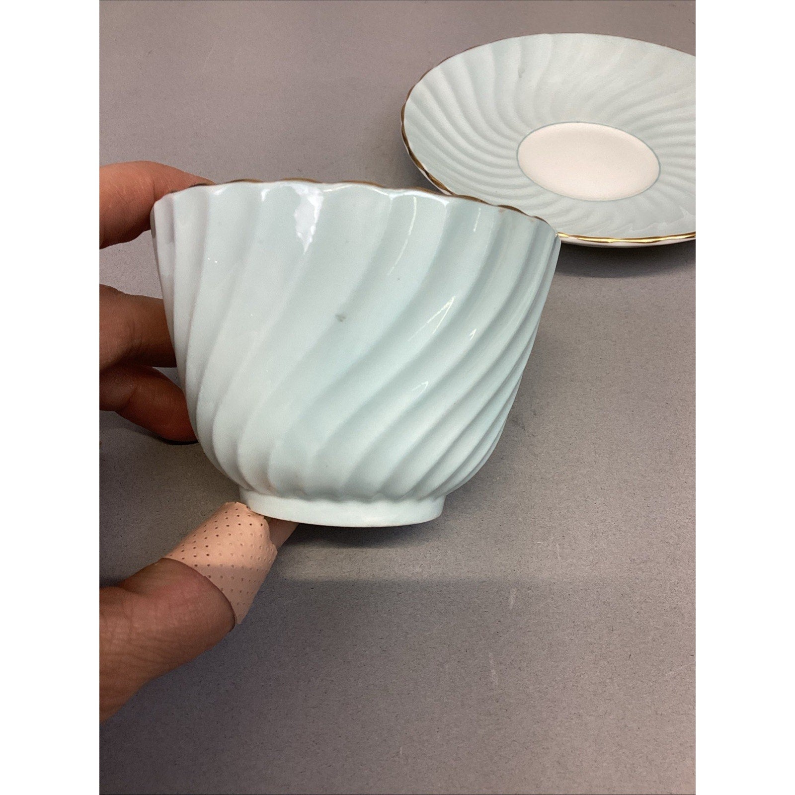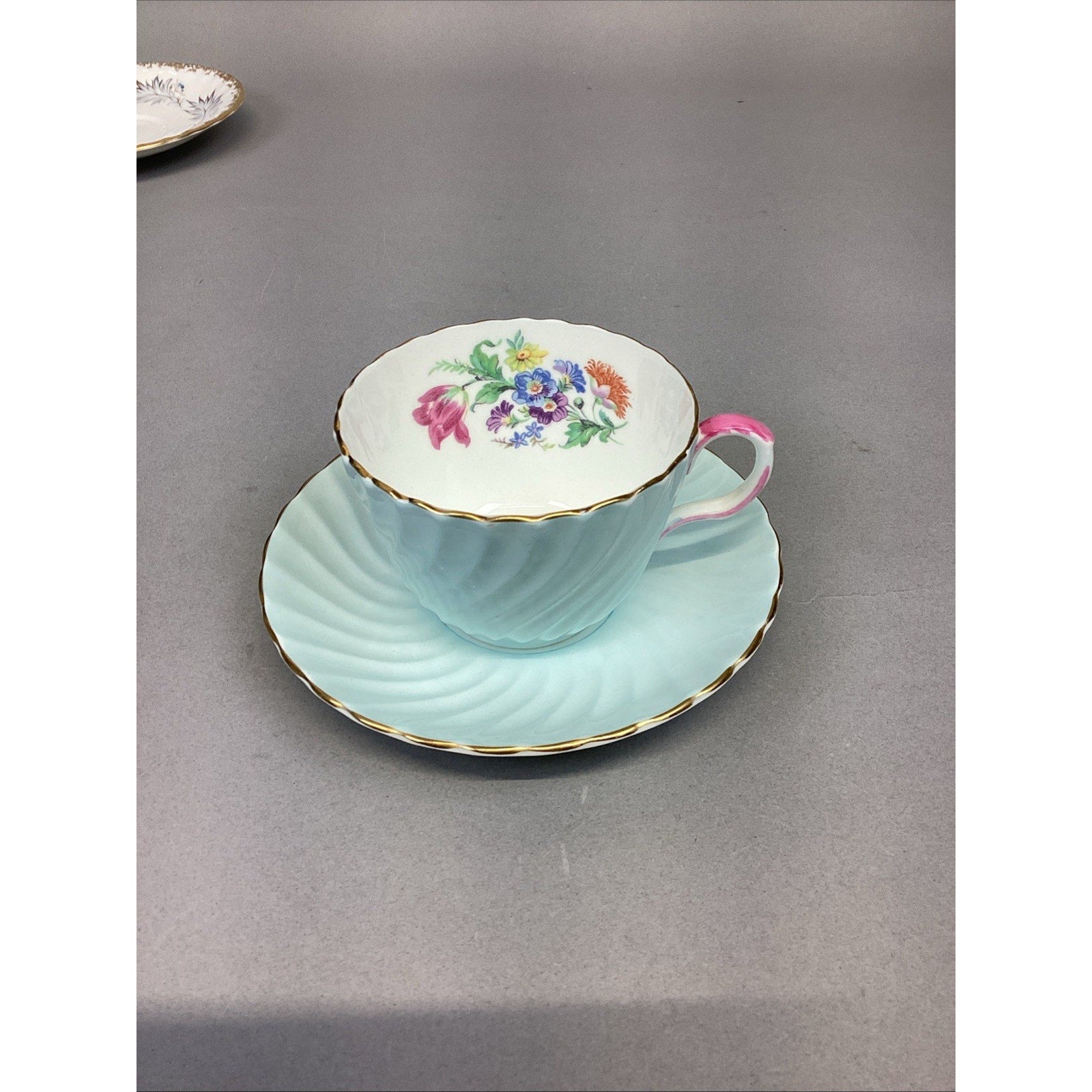 5. Aynsley light blue floral cup and saucer. Bone China. Made in England. Cup measures 2.5”Hx3.25”D. Saucer is 5.5”D. This saucer has 2 stains.