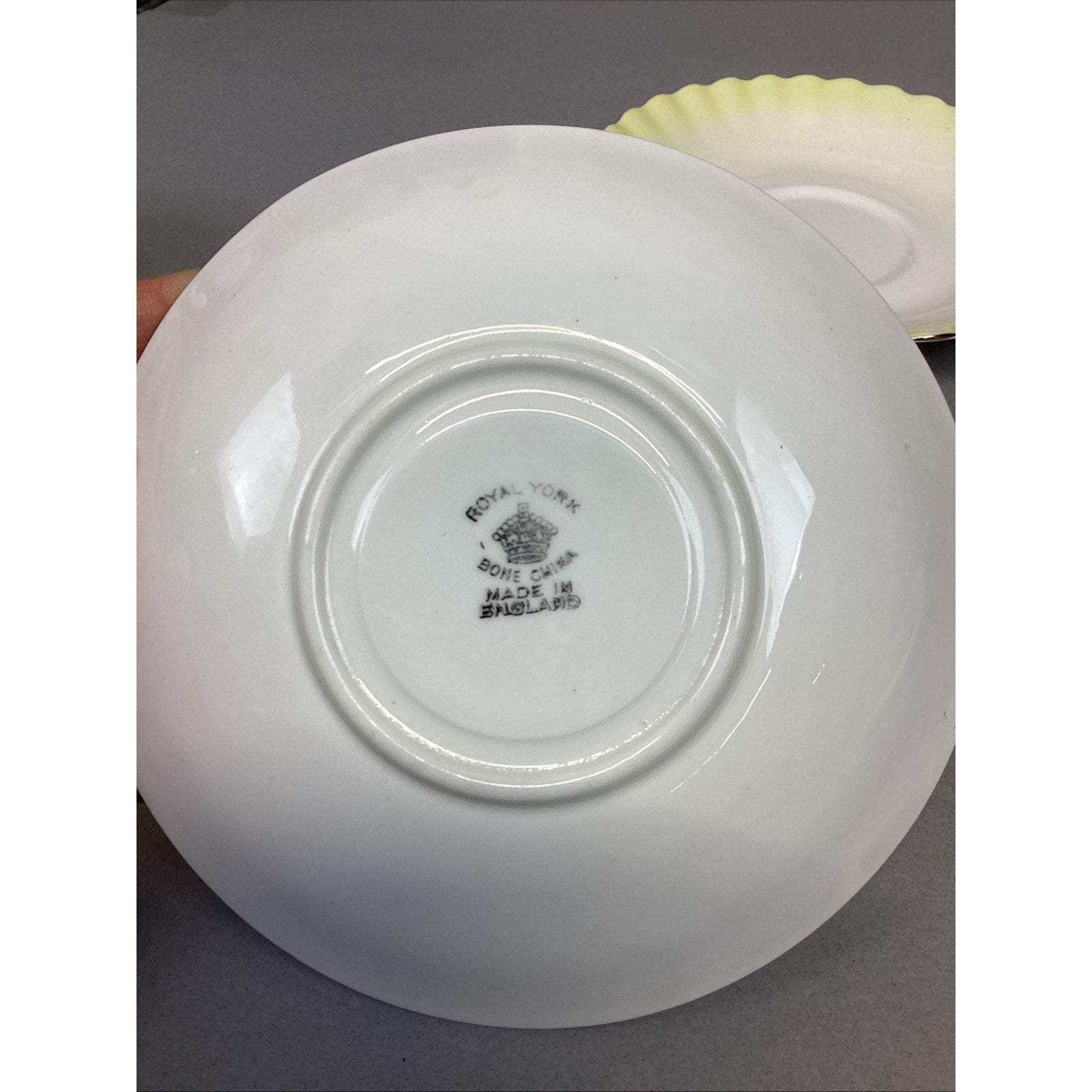 2. Royal York. Blue and white cup and saucer. Bone China. Made in England. Cup measures 2 7/8”Hx3.5”D and the saucer is 5.5”D. Both have a couple stains on them.