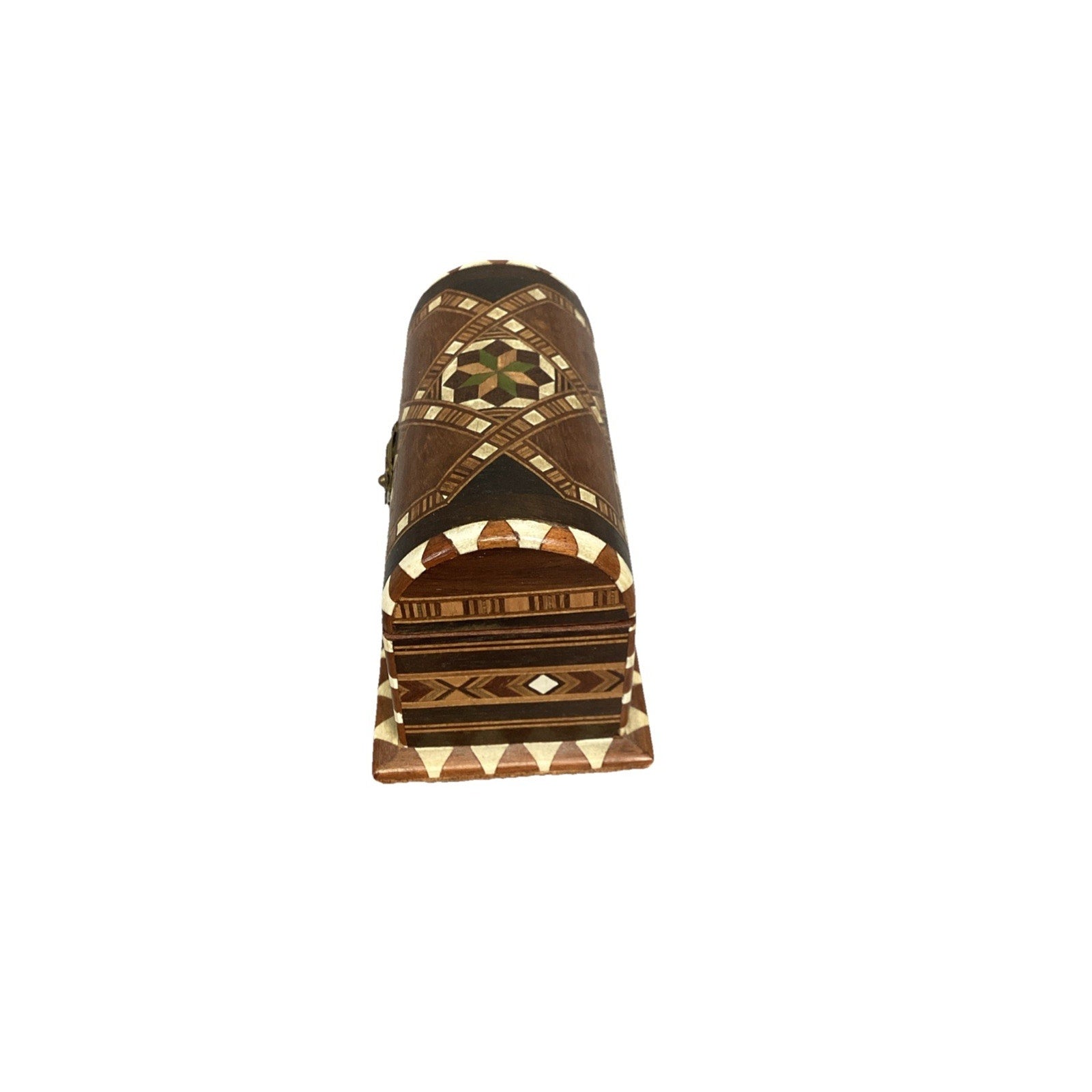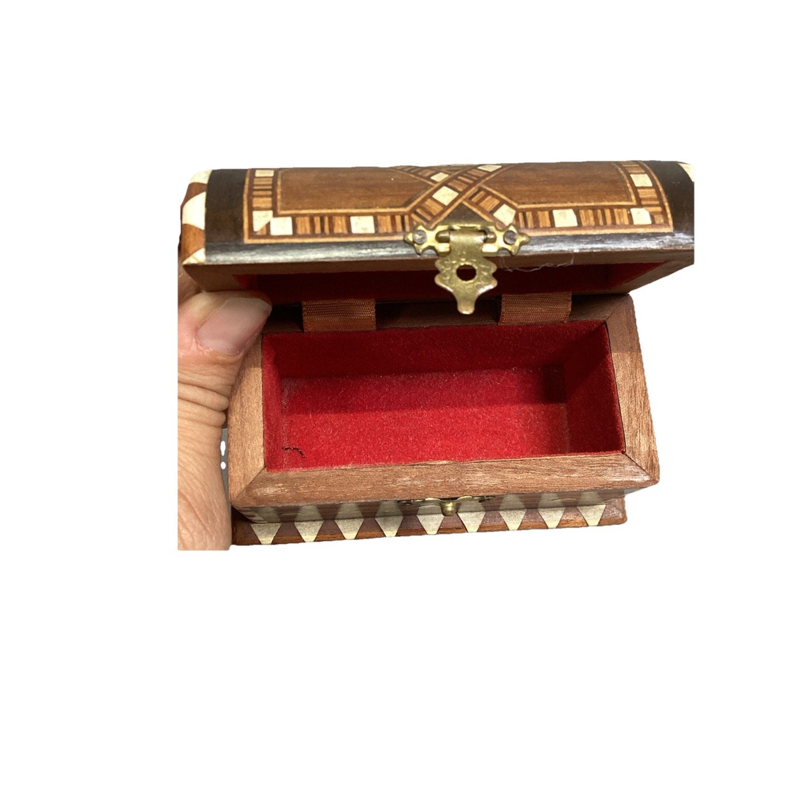 Wooden Inlay Geometric Design Jewelry Treasure Trinket Chest - 4x2.25x2.75” VTG